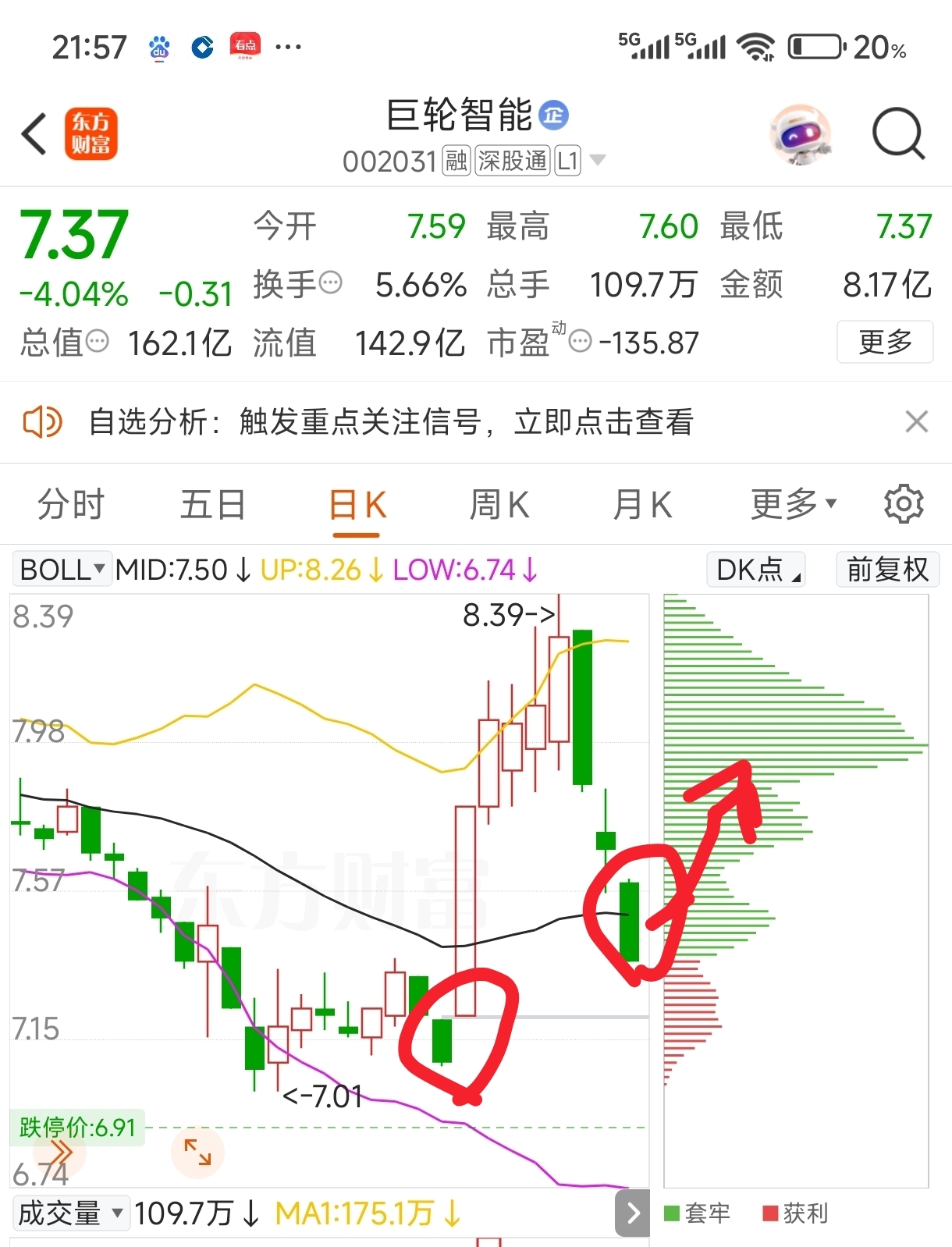 $巨轮智能(SZ002031)$ 预判明天走勇,高开7.46左右,收盘收缩量阳K线