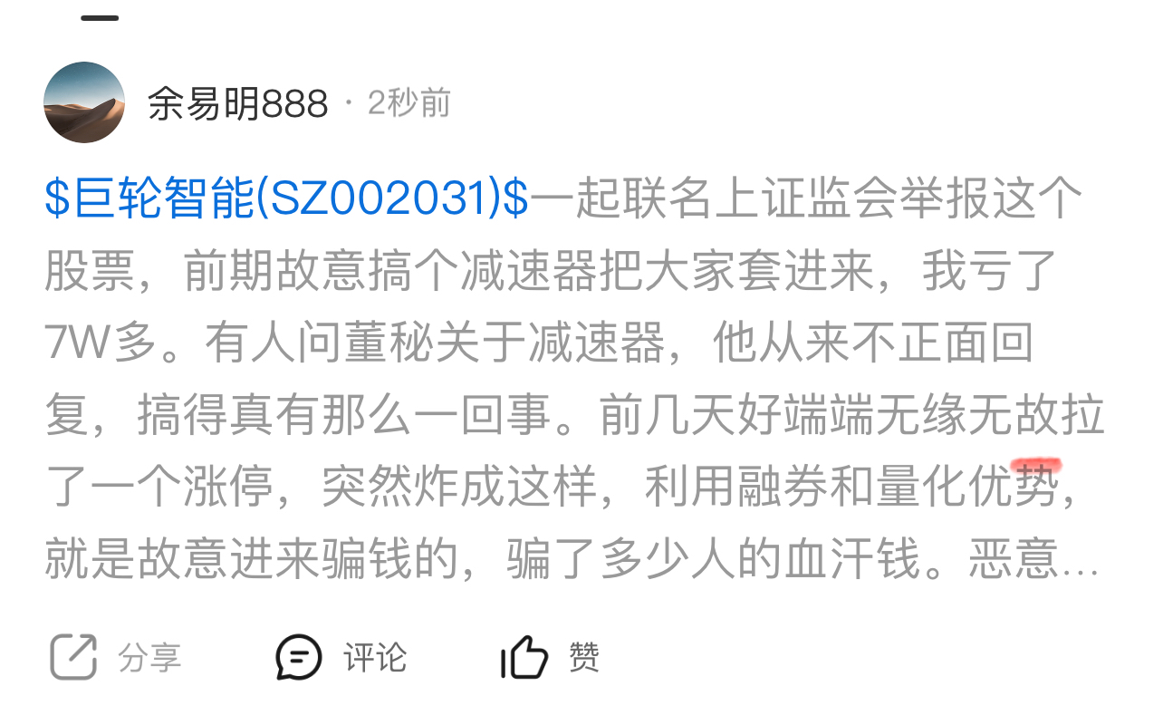 $巨轮智能(SZ002031)$ 为什么删我帖子,心里有鬼