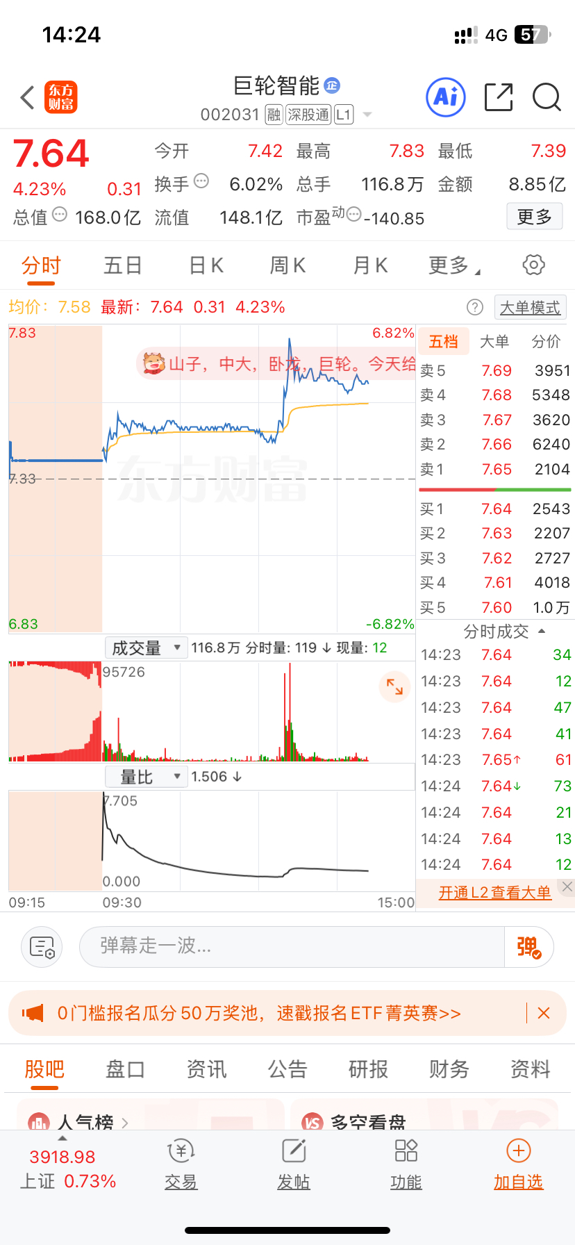 $巨轮智能(SZ002031)$ 资金分歧了,横盘,尾盘收7.59