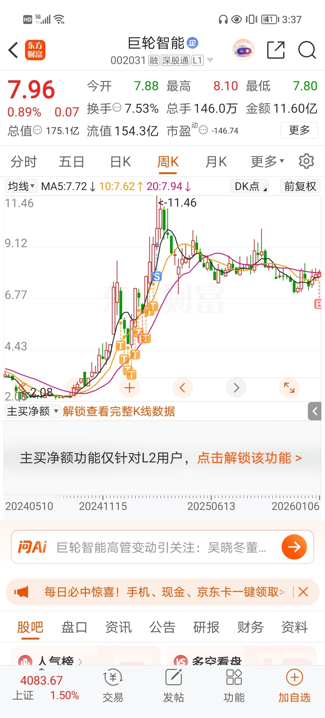 $巨轮智能(SZ002031)$ 海海海,我又来啦!