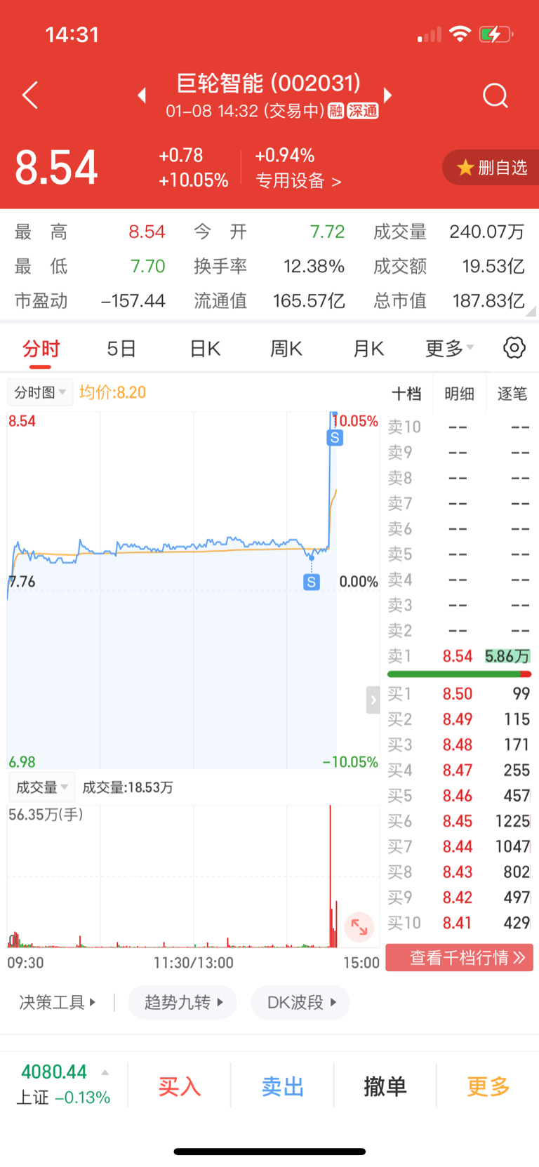 $巨轮智能(SZ002031)$ 看了一天卖了一半就拉涨停