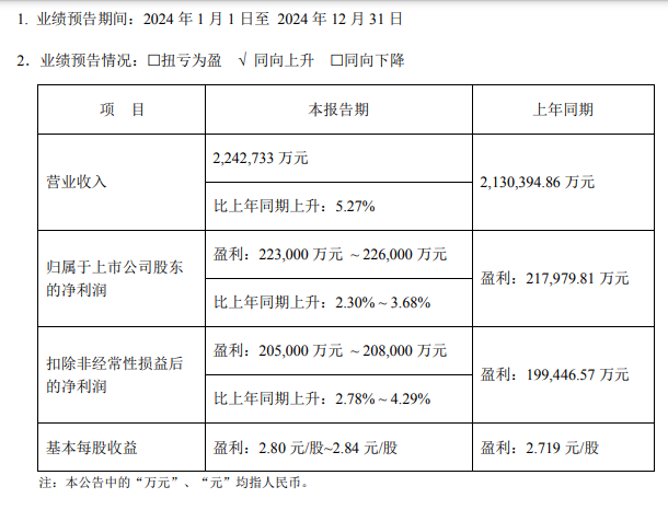 苏泊尔的业绩预告显示,2024年公司营收224.3亿元,同比上升5.3%;归属于上市公司股东的净利润区间22.3亿元-22.6亿元,同比上升2.3%-3.7%。