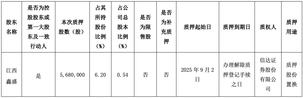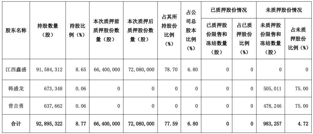 公告显示,江西鑫盛本次股份质押融资用于质押股份置换,不存在负担重大资产重组等业绩补偿。截至公告披露日,上述股东与一致行动人所持质押股份情况如下: