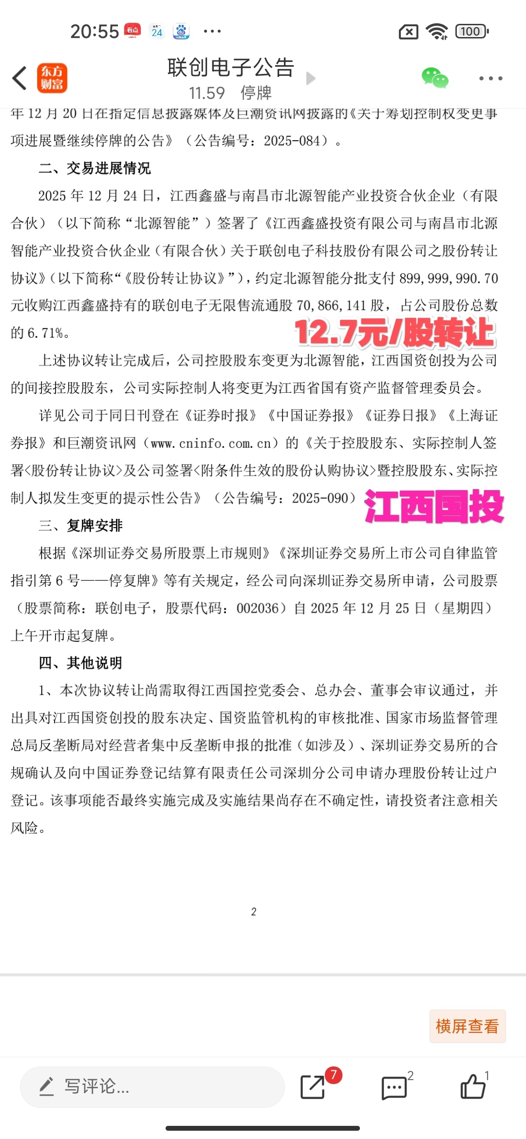 重大利好消息!江西国资委国资控股联创电子!收购价12.70元/股!联创停牌前11.59元!明天开盘多少钱?大家猜一猜?