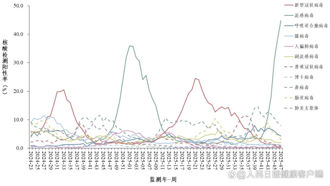 11月27日,中国疾病预防控制中心发布的《全国急性呼吸道传染病哨点监测情况(2025年第47周)》显示,在全国门急诊流感样病例中,流感阳性率接近45%,整体进入中流行水平,部分省份已达高流行水平。