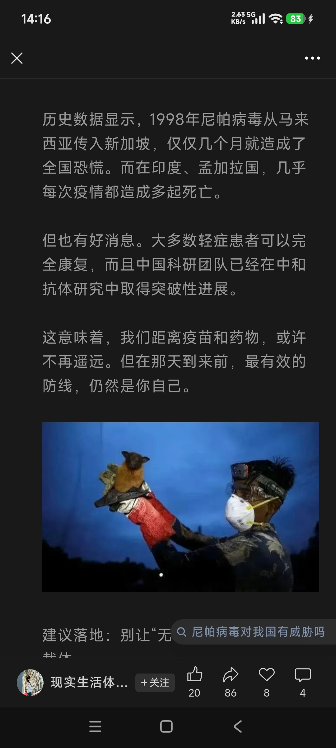 $双鹭药业(SZ002038)$ 尼帕病毒,是由蝙蝠传播,蝙蝠口水与尿液,也可传播!所以蝙蝠吃过的水果,也能传播!