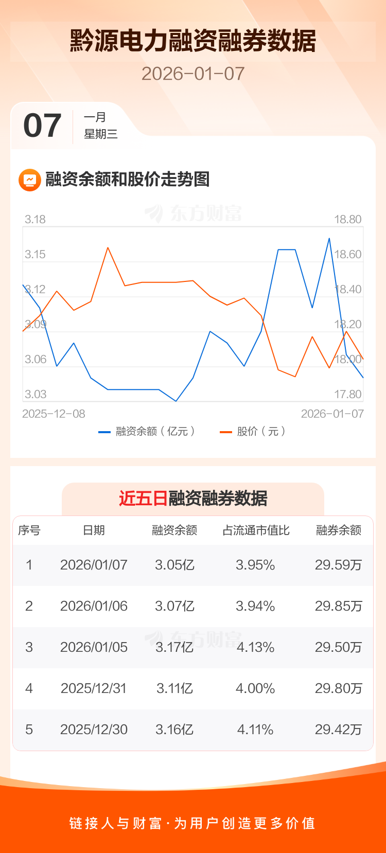 黔源电力:融资净偿还170.16万元,融资余额3.05亿元