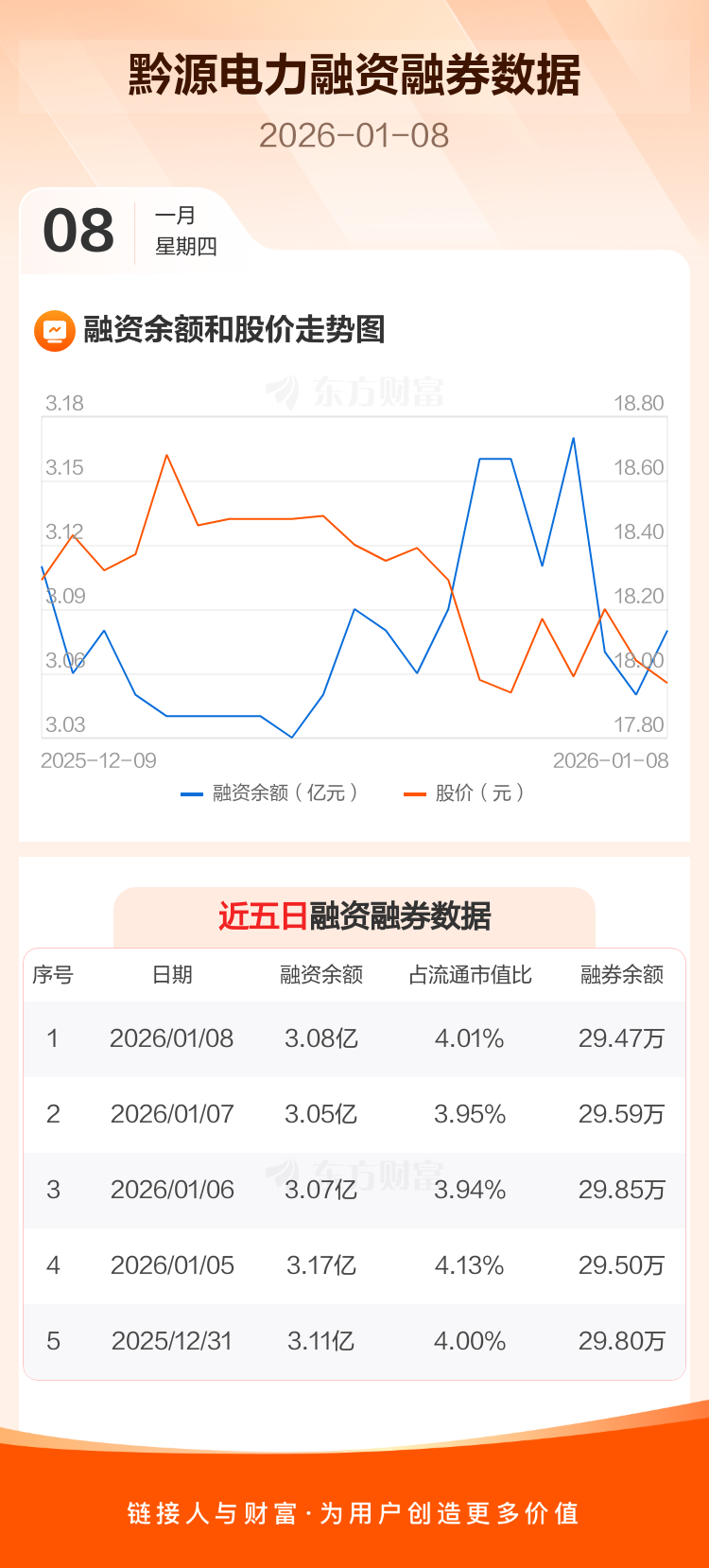 交易所最新数据显示,黔源电力于2026年1月8日获融资买入779.98万元,融资偿还451.15万元,当日融资净买入328.83万元。目前,该股融资余额3.08亿,占流通市值比例为4.01%。