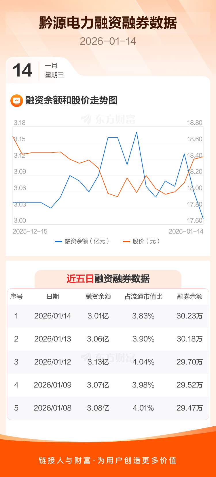 交易所最新数据显示,黔源电力于2026年1月14日获融资买入1491.22万元,融资偿还1994.82万元,当日融资净偿还503.6万元。目前,该股融资余额3.01亿,占流通市值比例为3.83%。