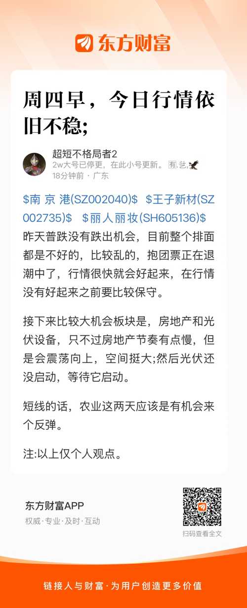 $南 京 港(SZ002040)$ $王子新材(SZ002735)$ $丽人丽妆(SH605136)$ 昨天普跌没有跌出机会,目前整个排面都是不好的,比较乱的,抱团票正在退潮中了,行情很快就会好起来,在行情没有好起来之前要比较保守。