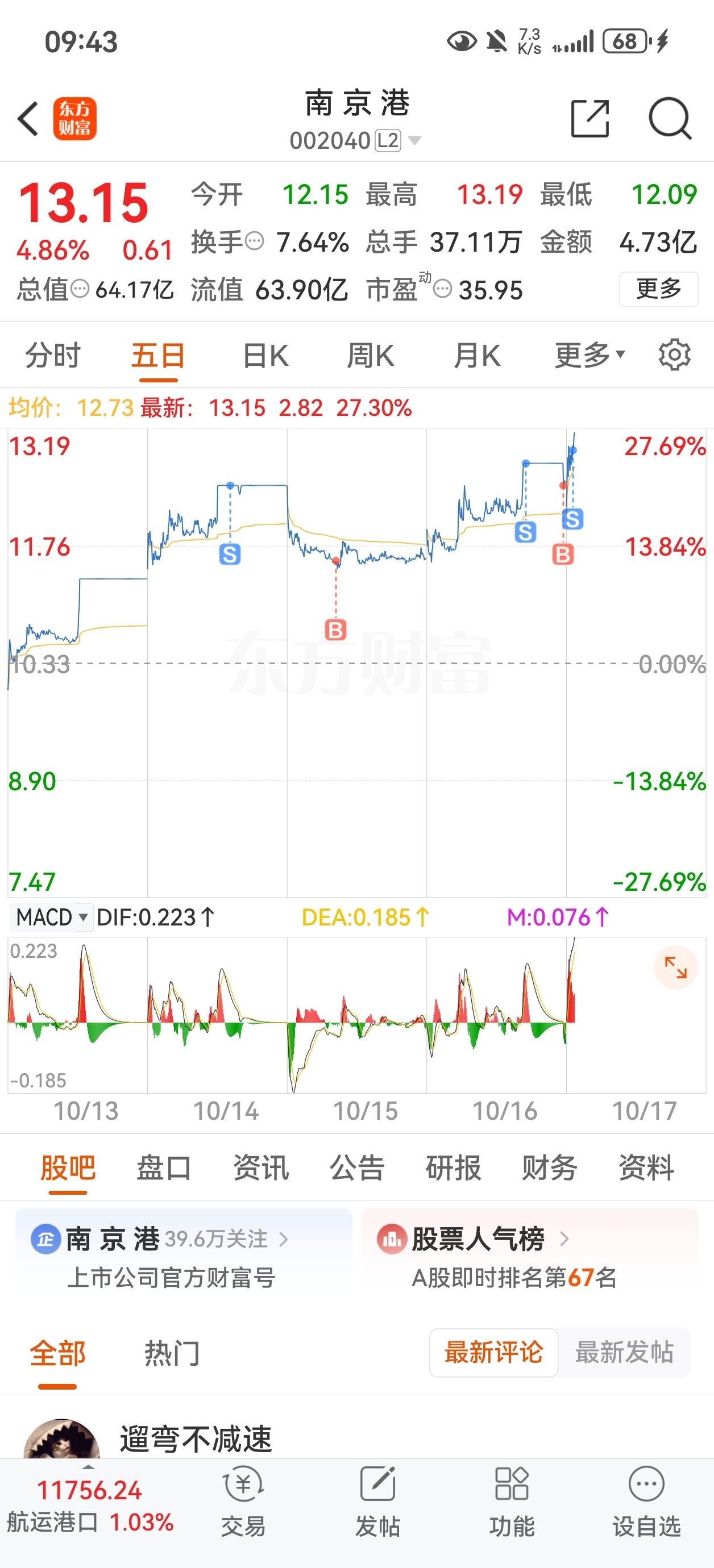 $南 京 港(SZ002040)$ 昨天炸板接回来,今天3个点出了,这个位置有点危险保住利润走了。