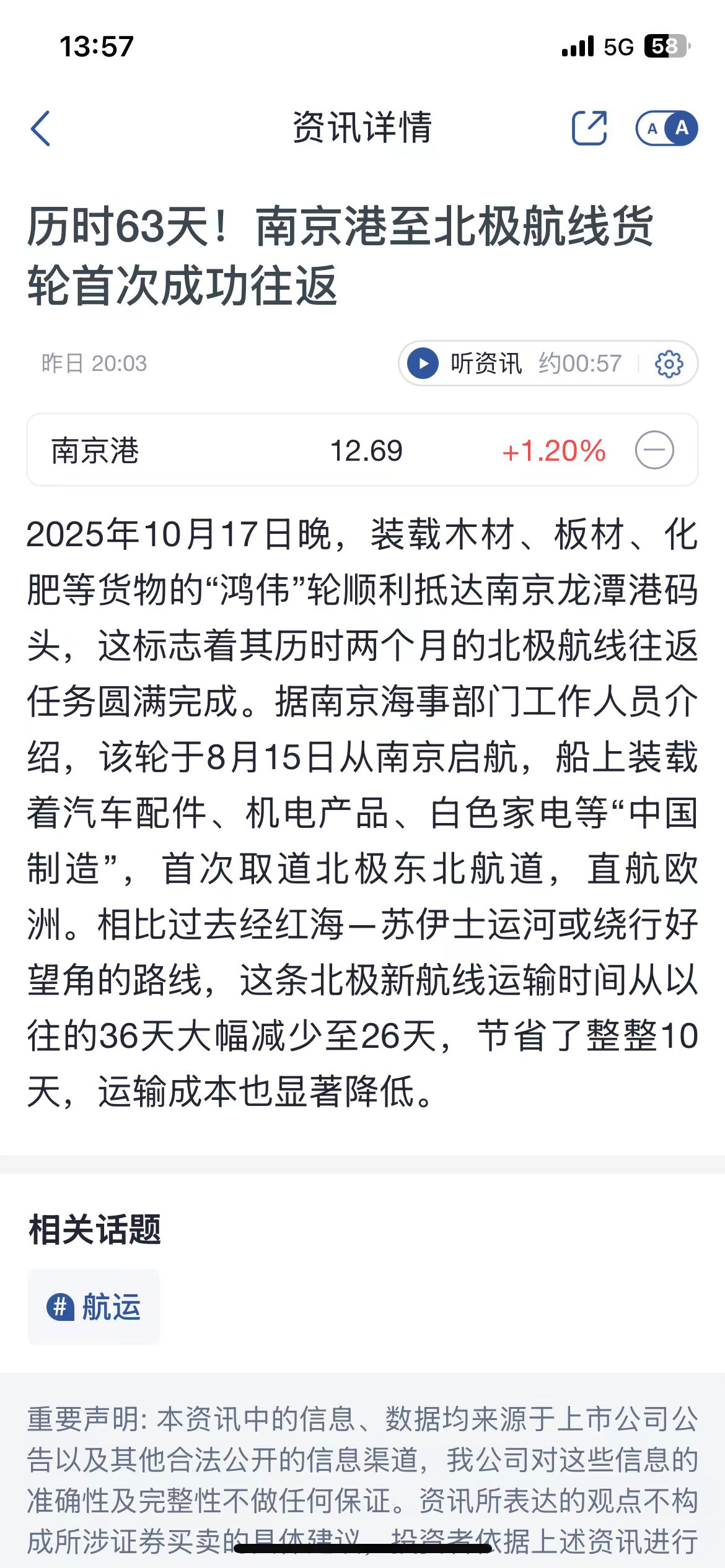 历时63天,南京港至北极航线货轮首次成功往返。