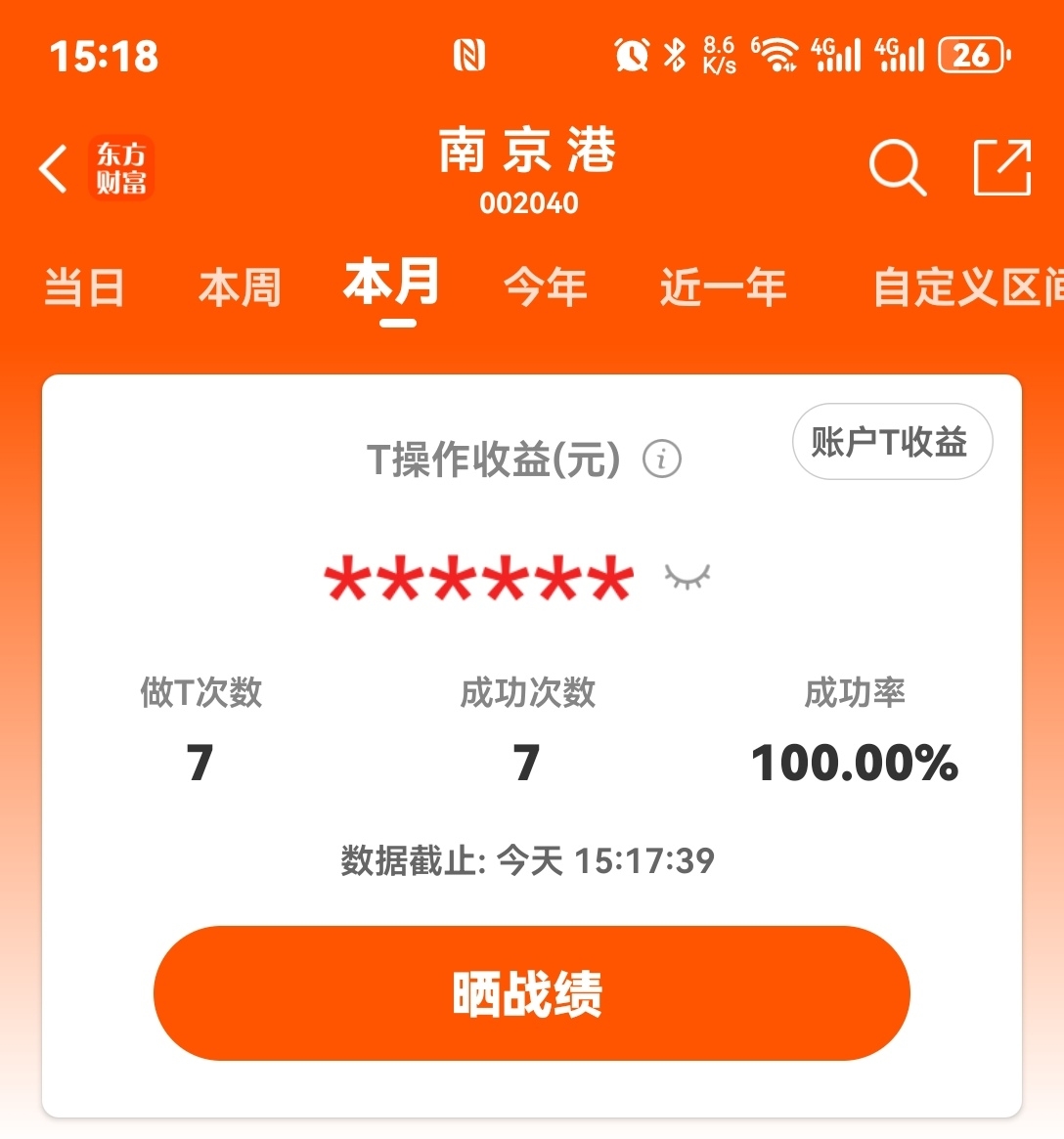 南京港本月截止今天共14个交易日,实际做T14天/次,中间清仓一天,统计数据只记后面7天,成功率100%,做T利润39.7%(不算股价本身上涨点位)