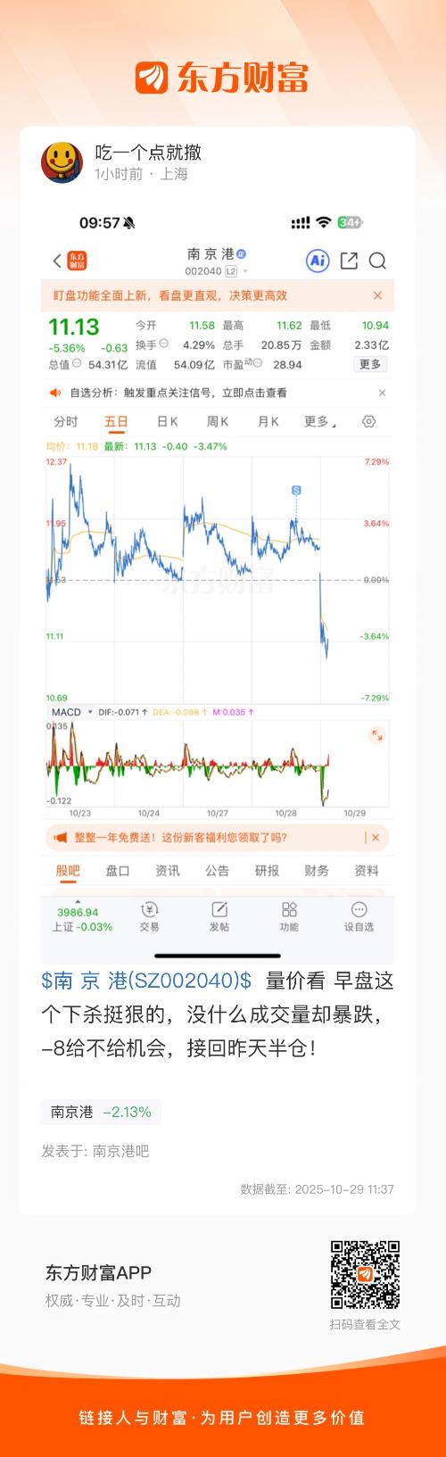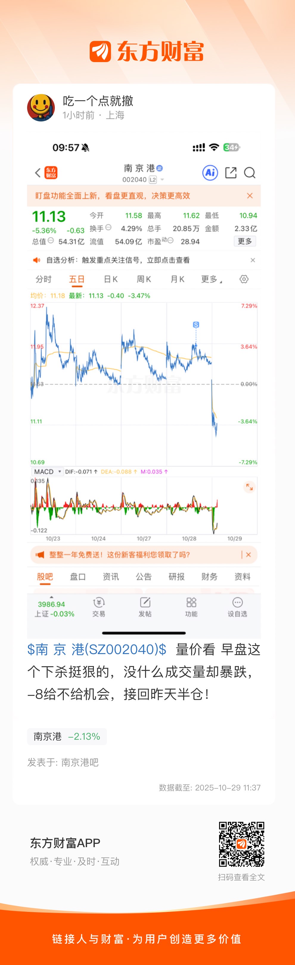 $南 京 港(SZ002040)$  量价看 早盘这个下杀挺狠的,没什么成交量却暴跌,-8给不给机会,接回昨天半仓!