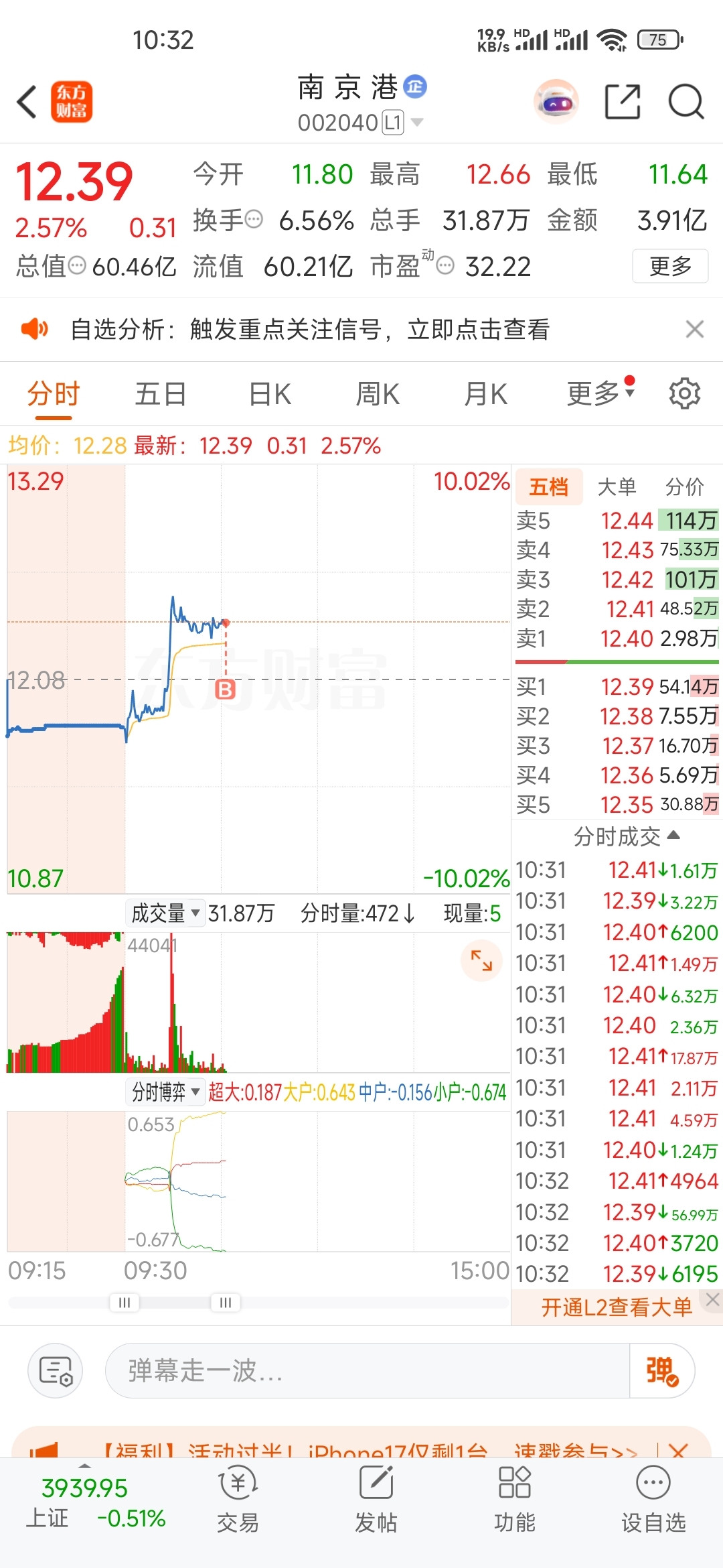 $南 京 港(SZ002040)$ 买进了 我感觉不简单今天 横盘挺久的 还放量了 博一手 打不了明天还给我放出来