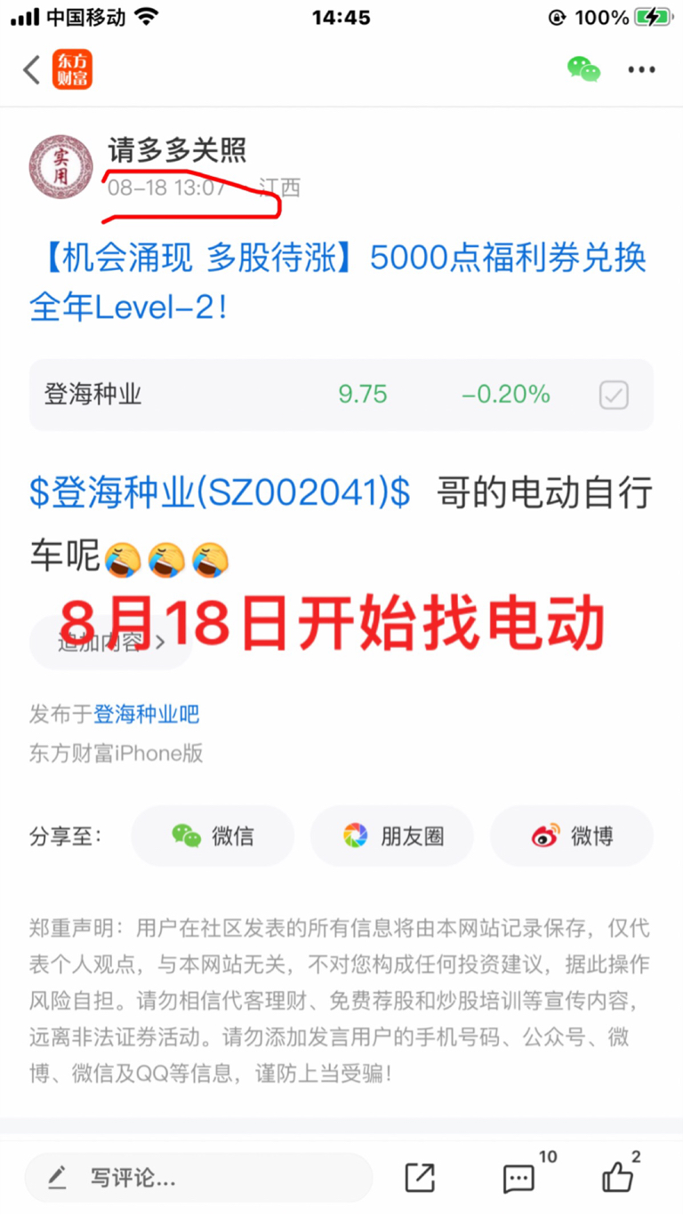 $登海种业(SZ002041)$ 从8月18号一直找电动车,到目前都没有找到,麻烦主力给个机会呗