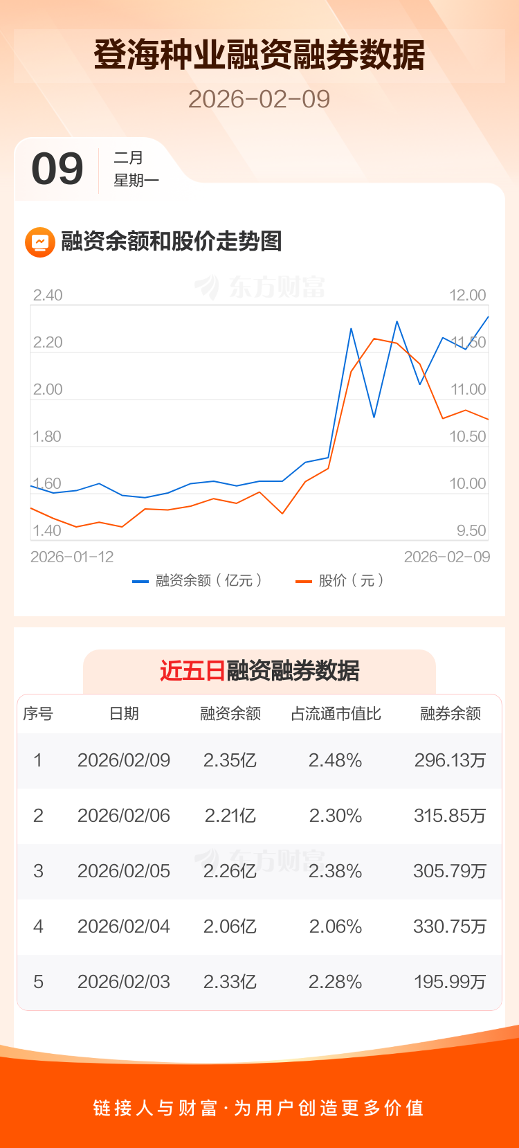 交易所最新数据显示,登海种业于2026年2月9日获融资买入6167.62万元,融资偿还4730.20万元,当日融资净买入1437.42万元。目前,该股融资余额2.35亿,占流通市值比例为2.48%。