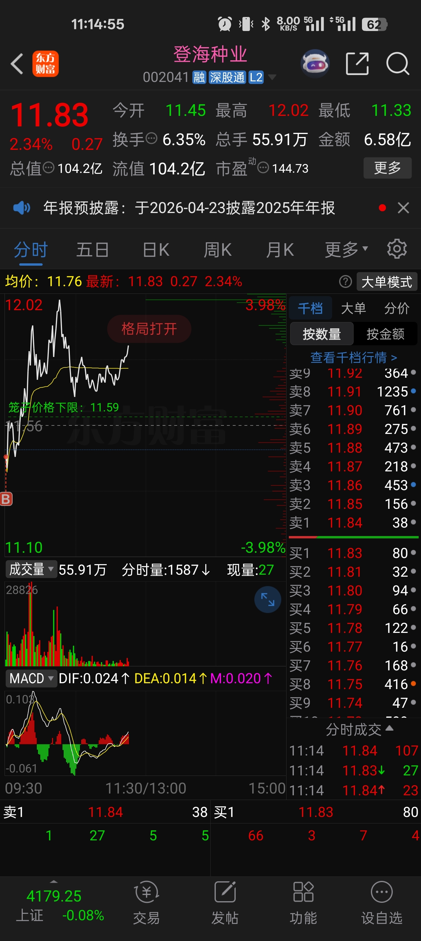 $登海种业(SZ002041)$ 昨天早盘竞价11.5进来的,本来今天打算封板就继续持有,但是没封成,尾盘卖了,祝车上各位继续发财