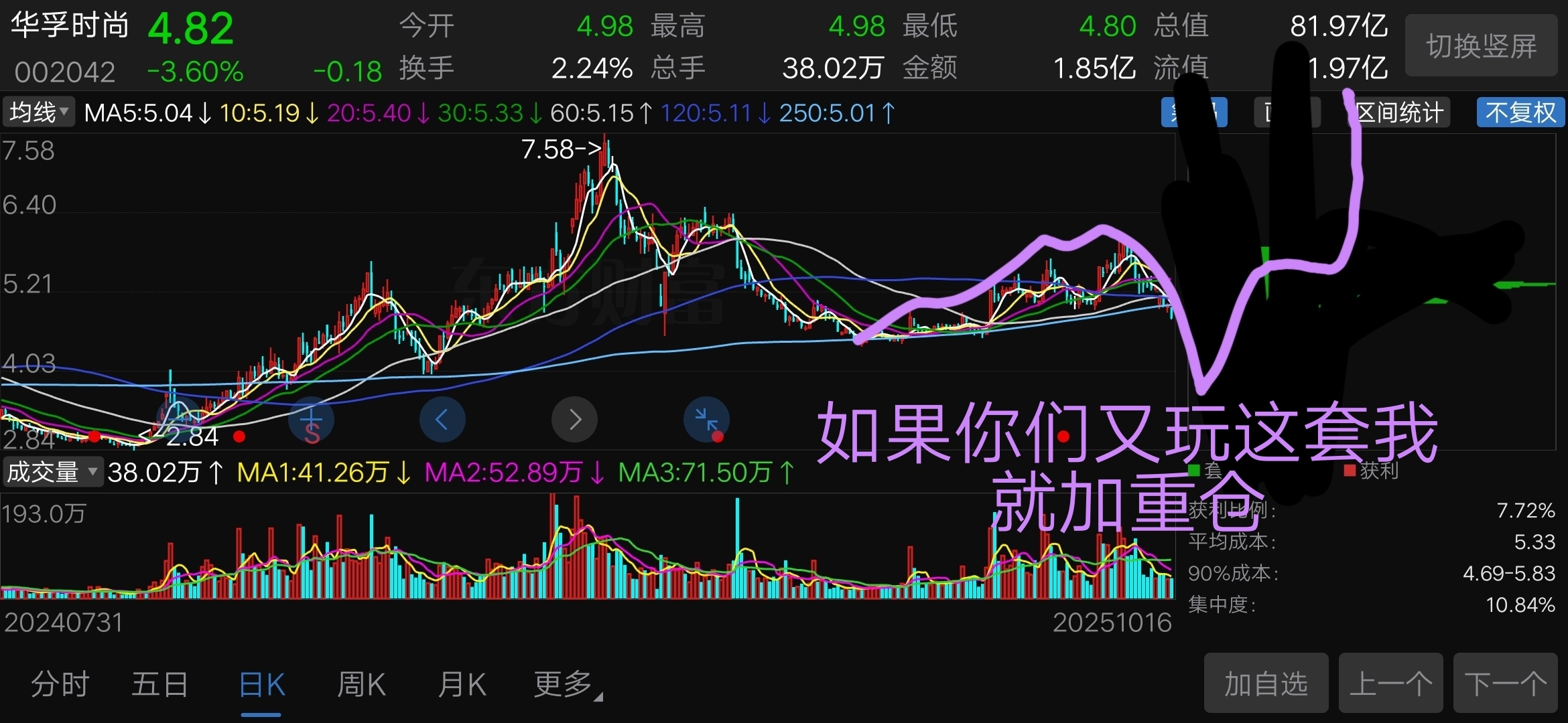 奉劝和中金公司勾一起监空我账户的华孚时尚操盘手们,如果你再玩老一套砸到4块附近,