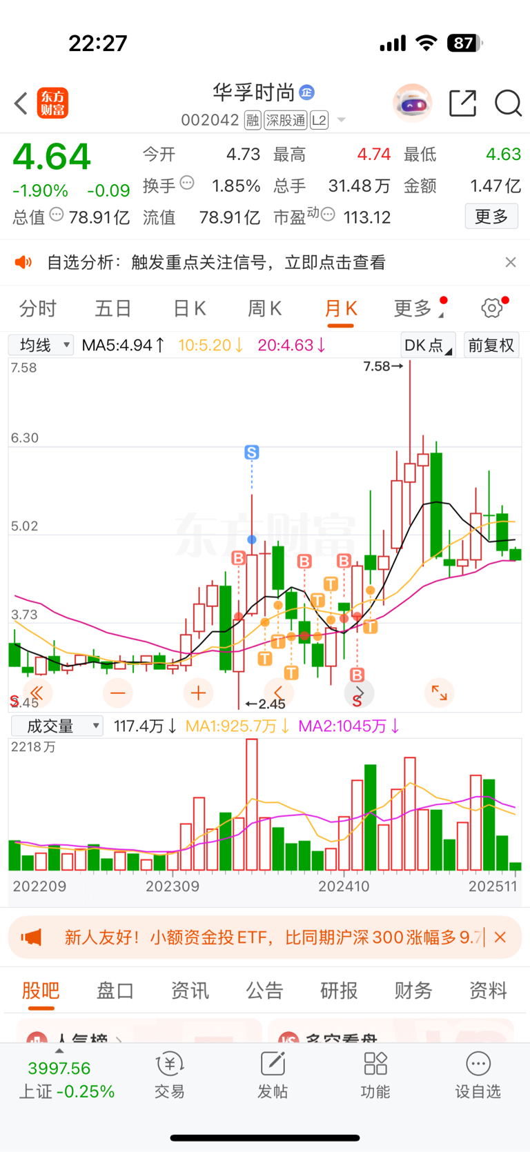 $华孚时尚(SZ002042)$ 不知不觉,离去年卖飞华孚到今天都快一年了啊,里面的兄弟过的也太苦了吧,以前的华孚四块都算高位了,现在看4.64感觉价格不算高呢