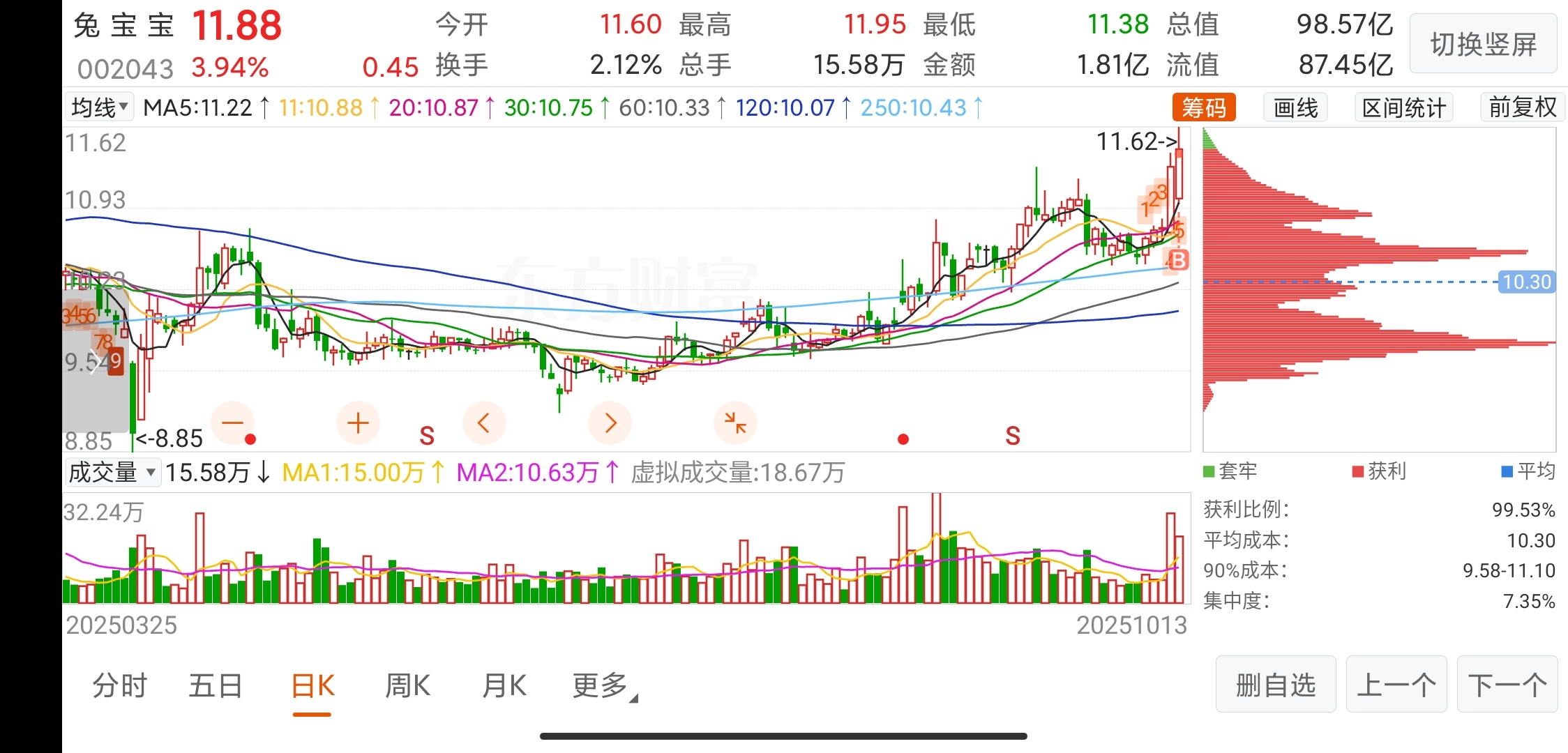 $兔 宝 宝(SZ002043)$ 没量冲高走了,换了恒实科技,刚突破合力