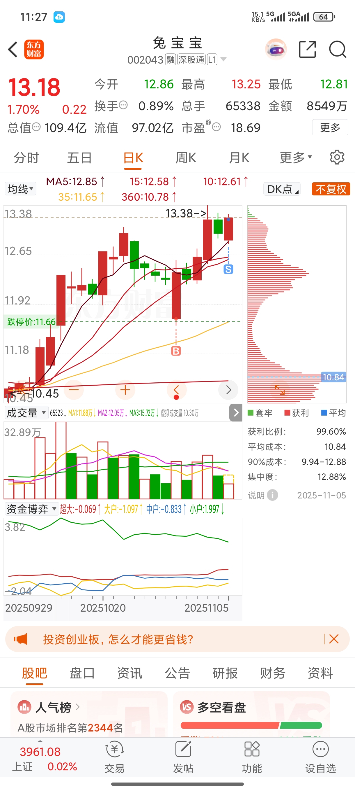$兔 宝 宝(SZ002043)$ 我看大家都等着涨,那我就出了吧
