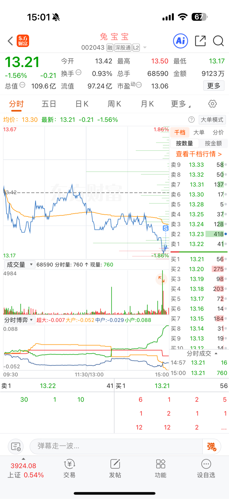 $兔 宝 宝(SZ002043)$ 走势不如意,剩下的半仓清完了,感谢兔子主力,今年这波赚了50%,知足了,等你下来,我还会回来的