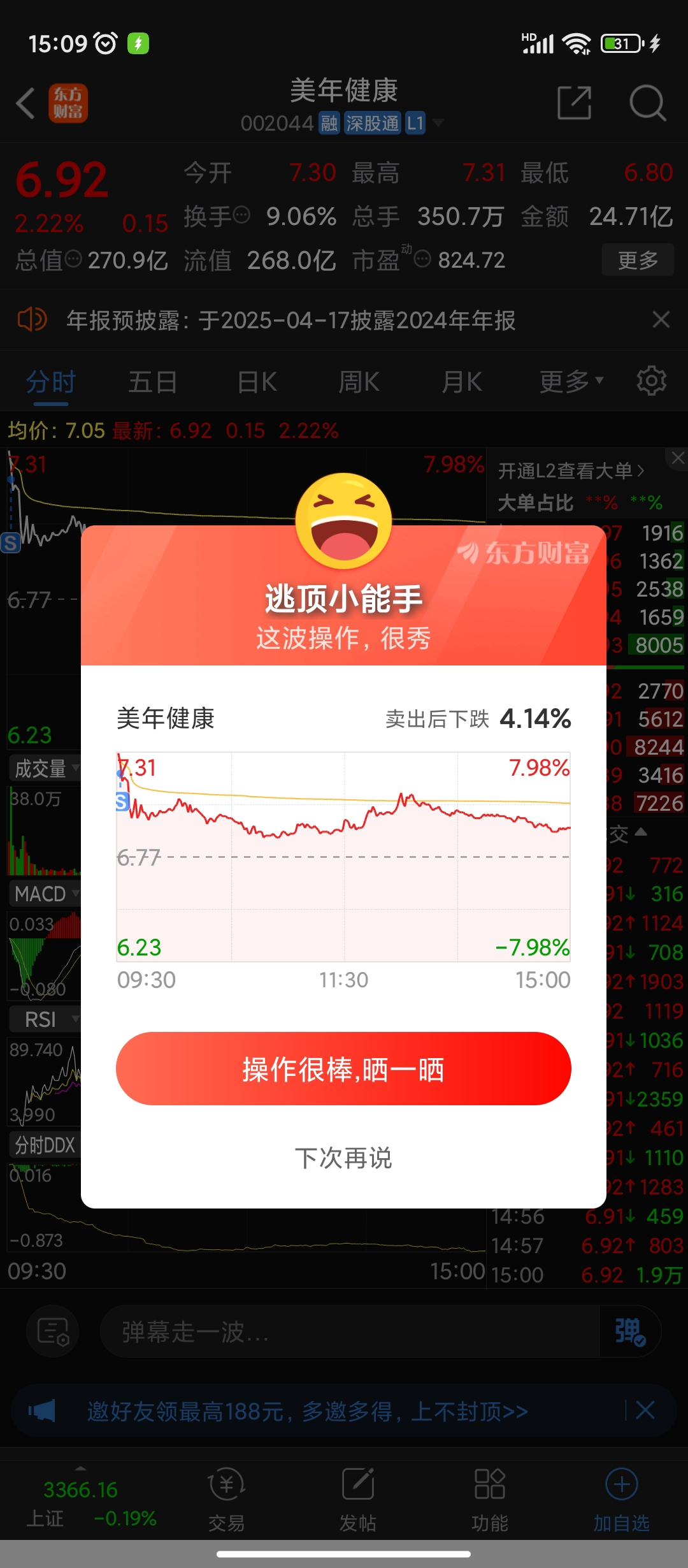$美年健康(SZ002044)$ 还好今天跑得快。