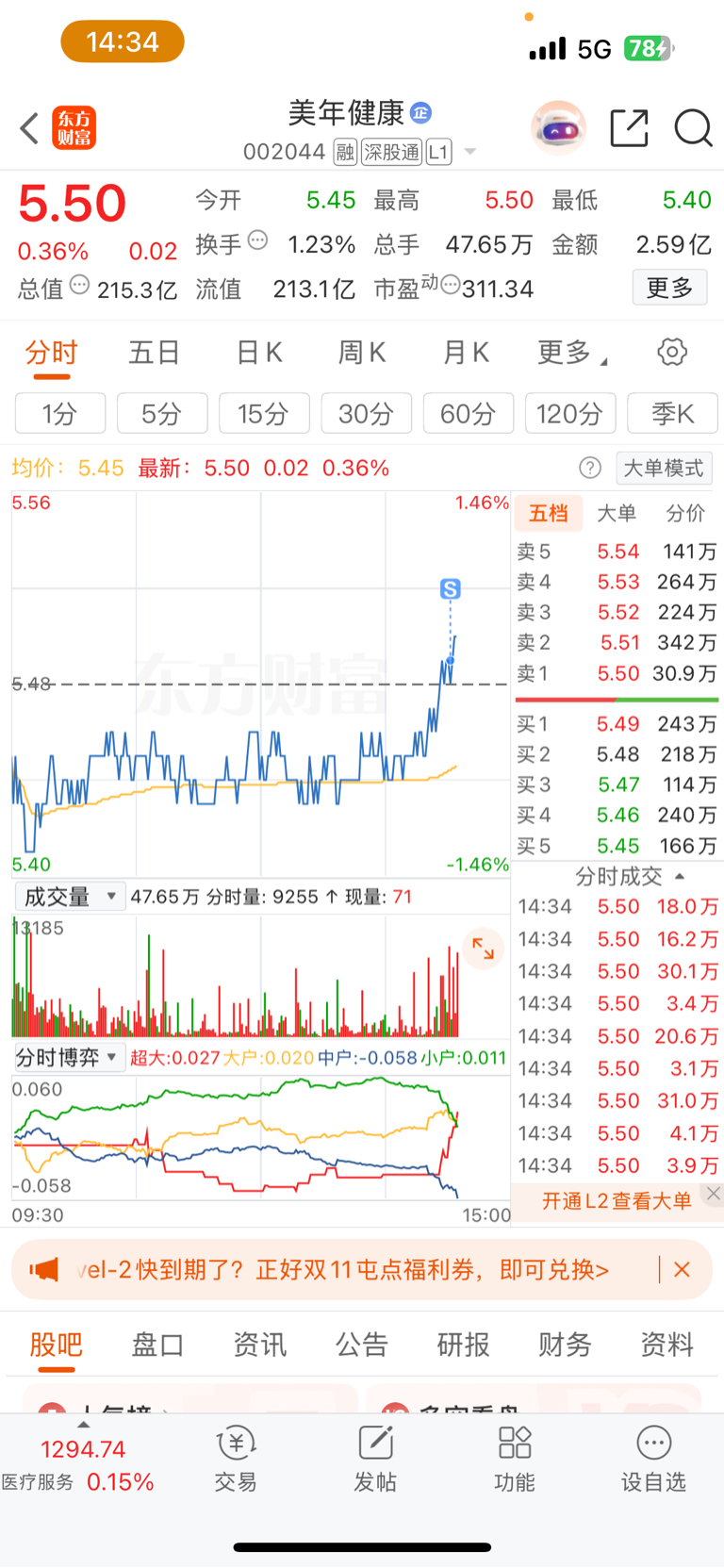 $美年健康(SZ002044)$ 5.50居然吃完了,5.49清仓了
