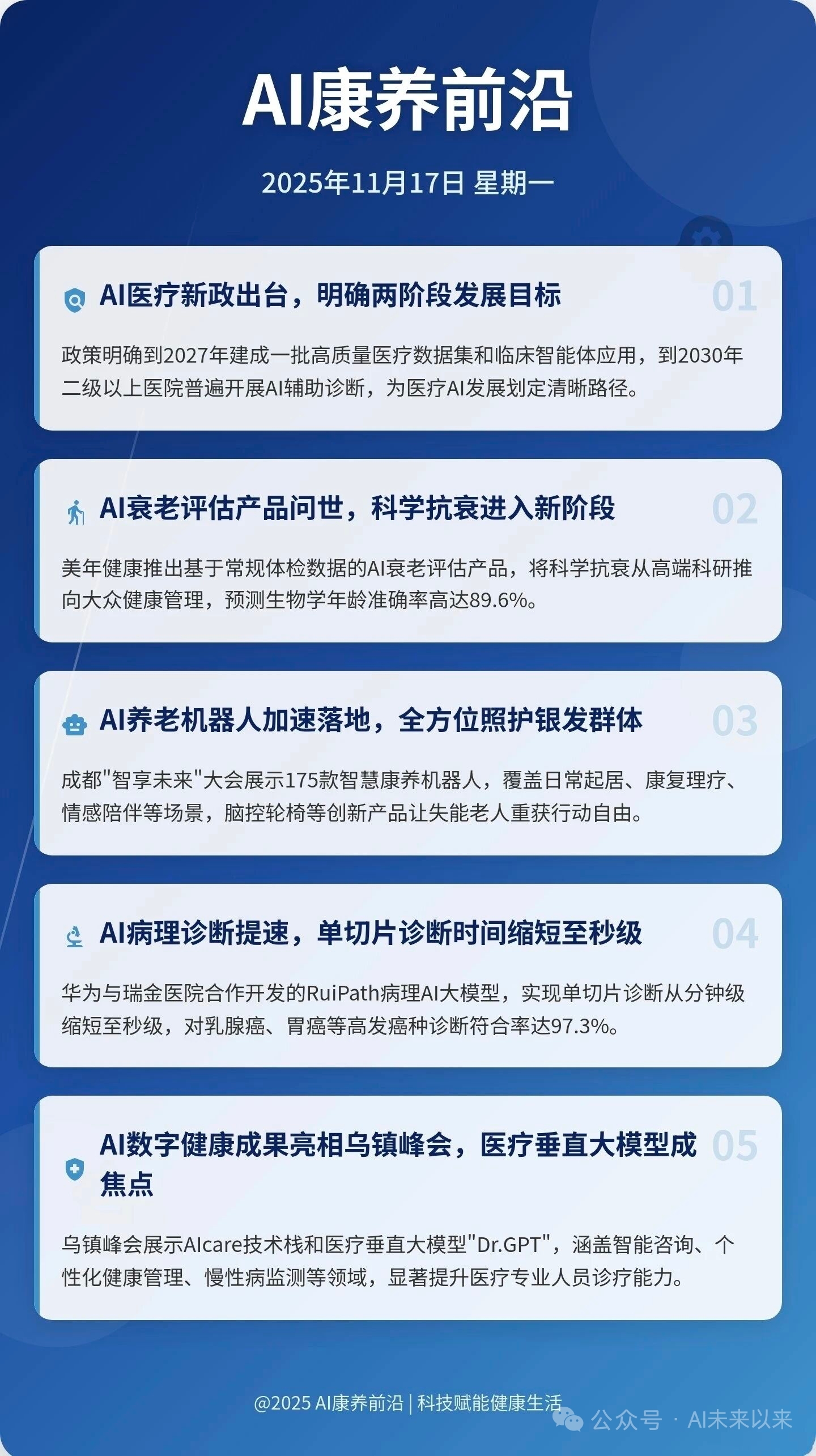 今日AI康养领域迎来多项突破性进展,美年健康推出AI衰老评估产品将抗衰推向大众健康管理,华为RuiPath实现病理诊断秒级提速,成都大会展示175款智慧康养机器人,乌镇峰会Dr.GPT引领医疗垂直大模型发展。从精准抗衰到快速诊断,从智能照护到健康管理,AI正全方位重塑医疗健康生态。快来看看这些前沿创新!