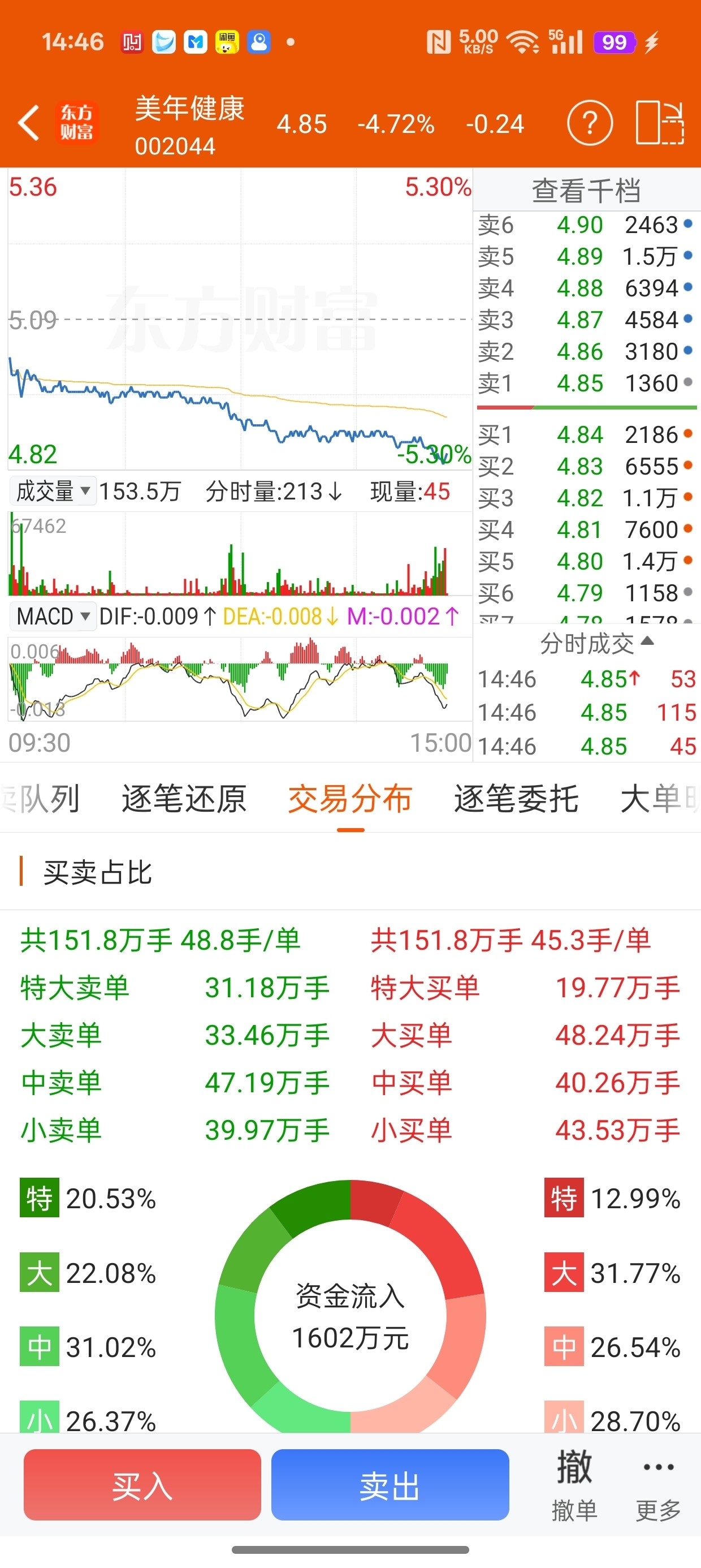 $美年健康(SZ002044)$ 大哥牛B,抄底来了!尾盘有恐慌盘出来!