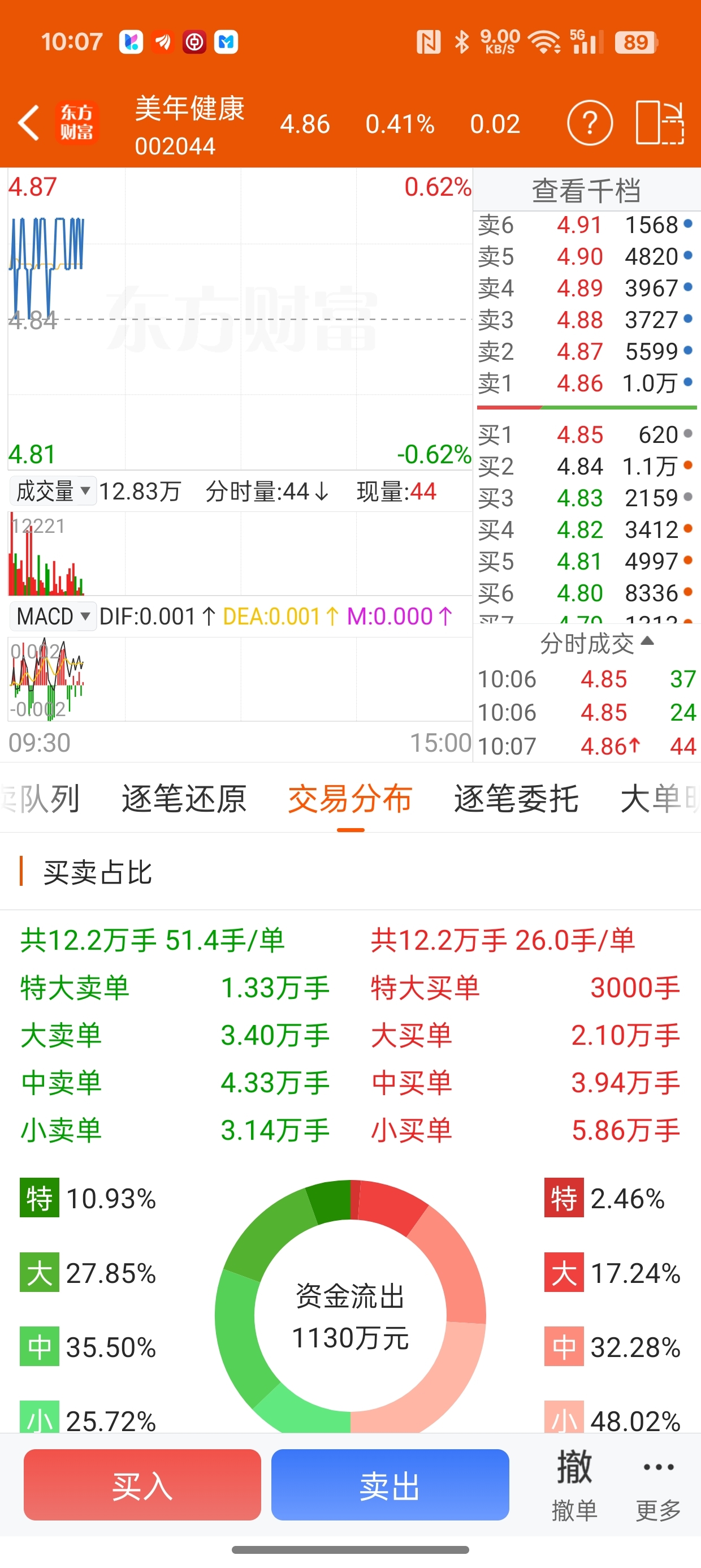 $美年健康(SZ002044)$ 今日主力还没有卖,散单买!看来还会跌