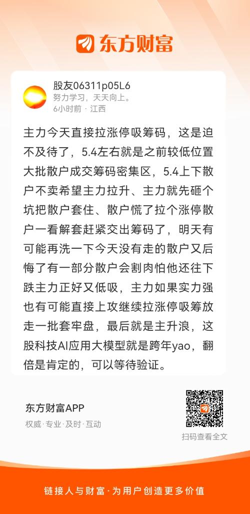 主力今天直接拉涨停吸筹码,这是迫不及待了,5.4左右就是之前较低位置大批散户成交筹码密集区,5.4上下散户不卖希望主力拉升、主力就先砸个坑把散户套住、散户慌了拉个涨停散户一看解套赶紧交出筹码了,明天有可能再洗一下今天没有走的散户又后悔了有一部分散户会割肉怕他还往下跌主力正好又低吸,主力如果实力强也有可能直接上攻继续拉涨停吸筹放走一批套牢盘,最后就是主升浪,这股科技AI应用大模型就是跨年yao,翻倍是肯定的,可以等待验证。