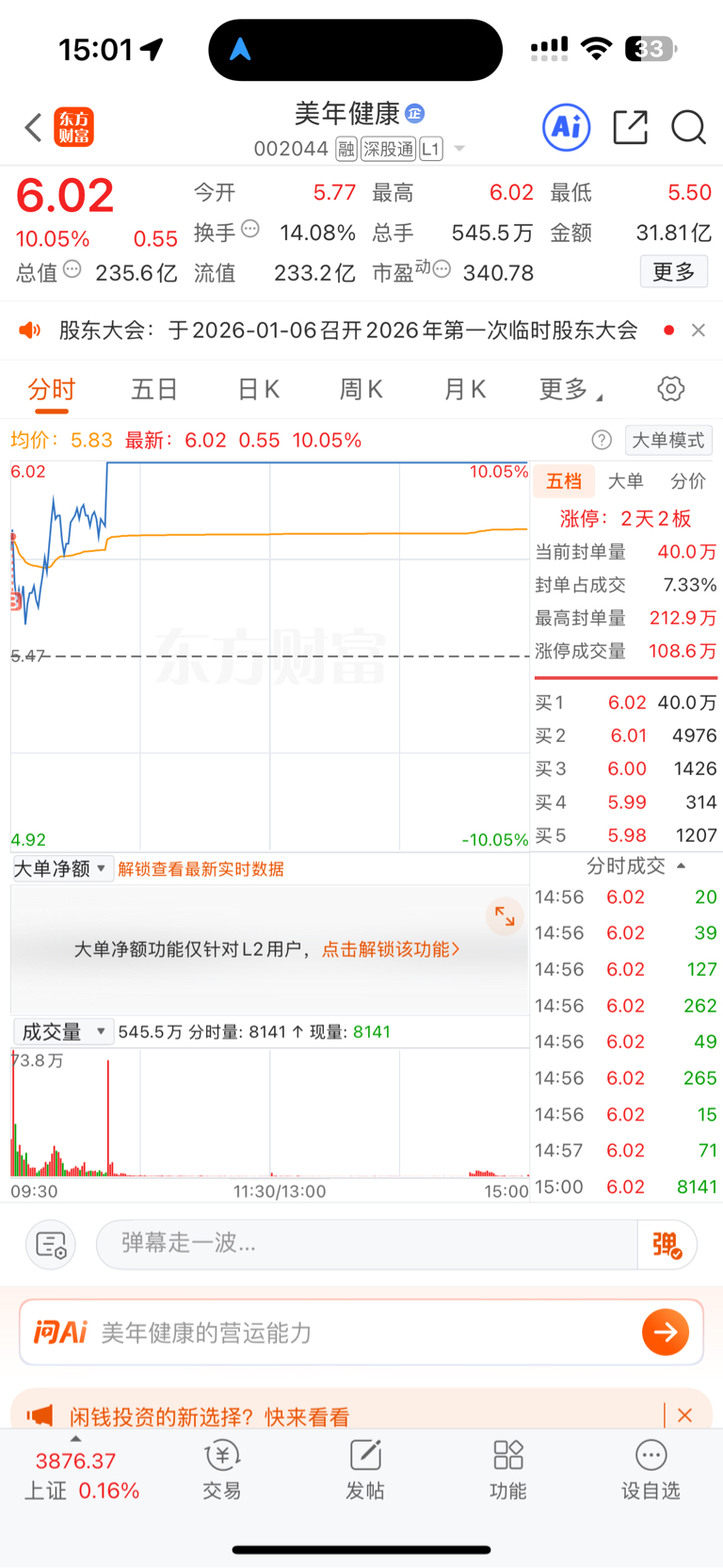 $美年健康(SZ002044)$ 睡觉,明天睁眼我要看到10cm,主力发发善心吧