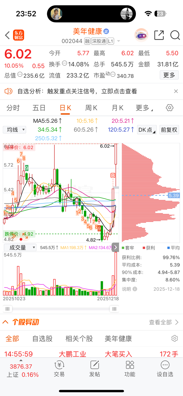 $美年健康(SZ002044)$ 买这只票纯属于偶然,只是头天晚上翻到了它的牌子,第二天异动了就追了。至于能走多远,不知道,随缘来,随缘去。