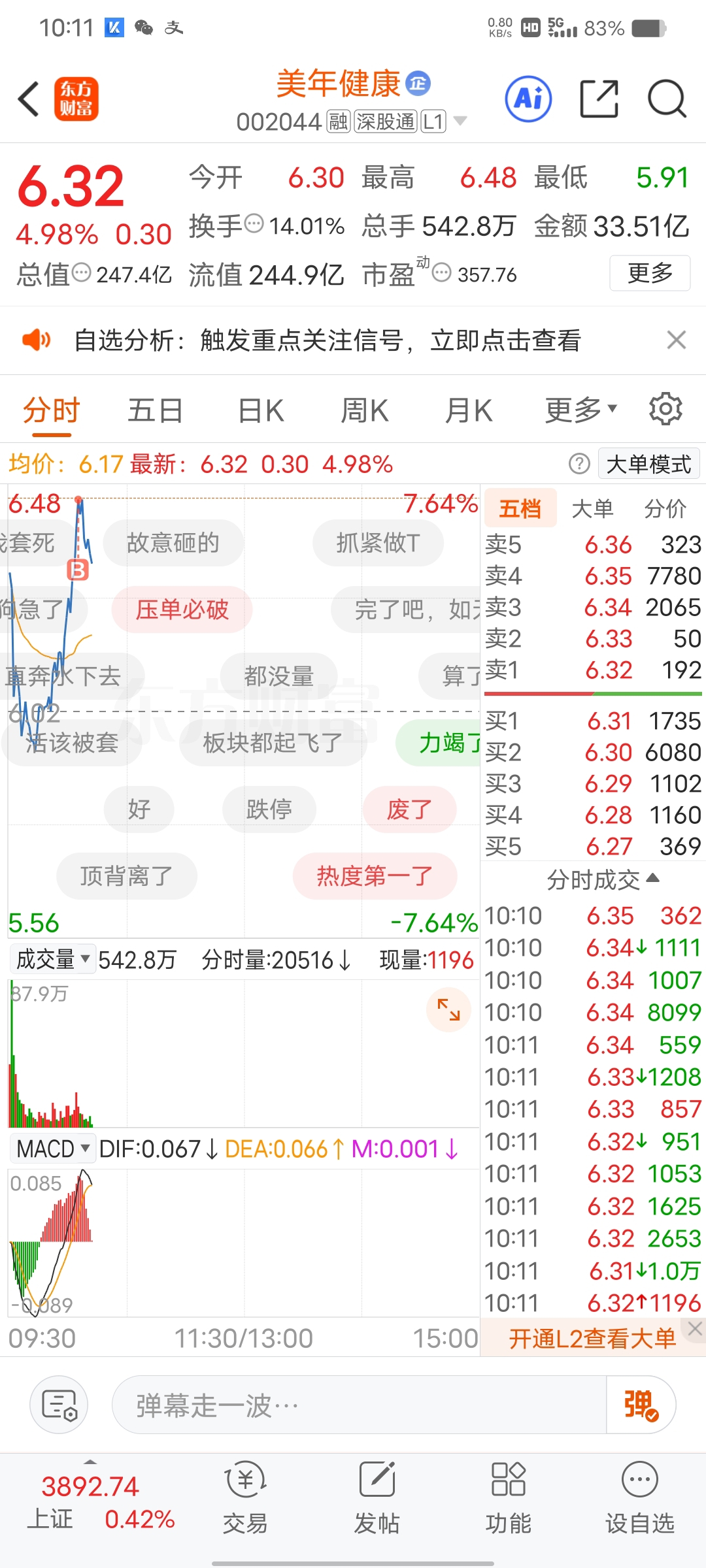 $美年健康(SZ002044)$ 兄弟们怪我,你们走吧。我进来必须跌几天。我卖了你们在买