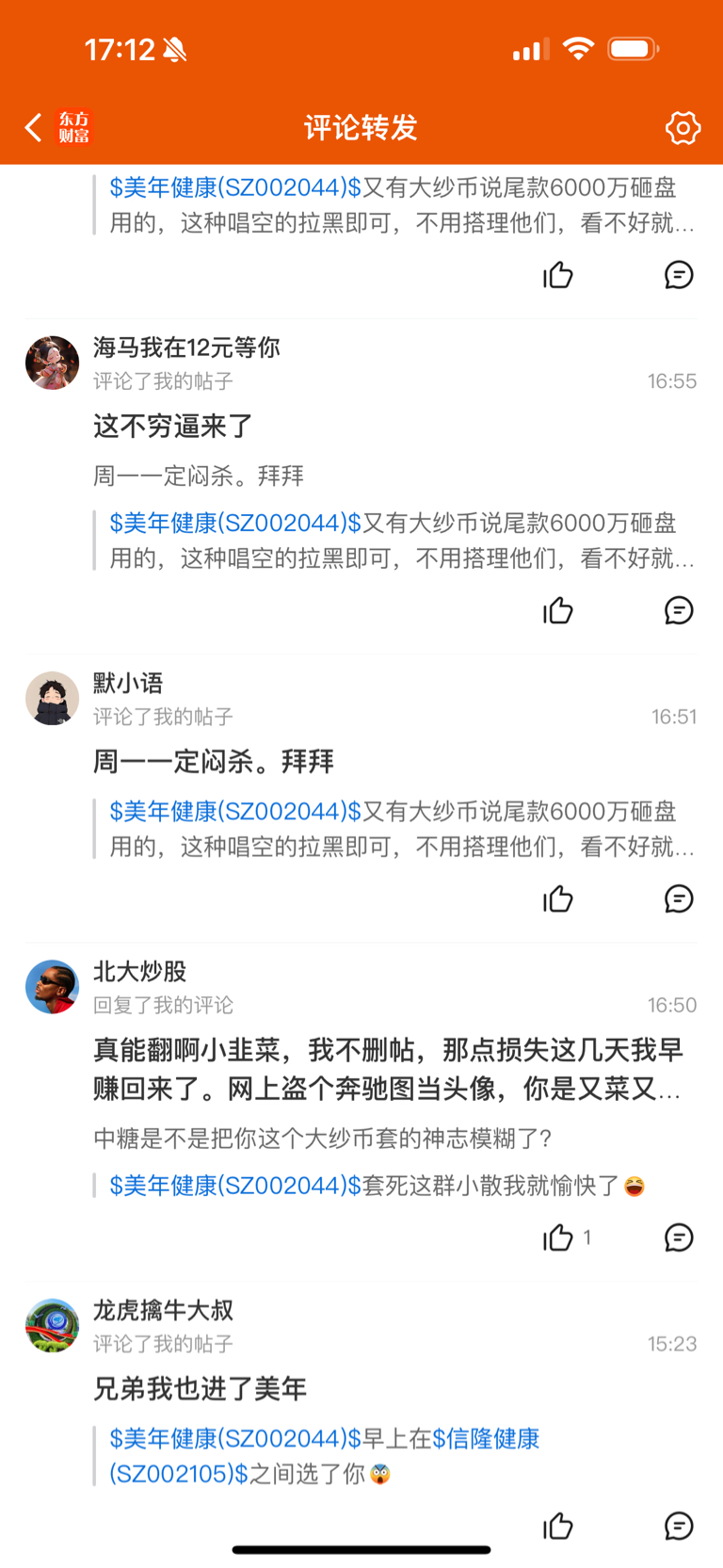$美年健康(SZ002044)$ 国人的素质是真差,老子刚想说我把app,行车证发出来,不是奔驰你是我养的,这杂毛玩意就把我拉黑了,不看好就去买其他股,天天唱空,心理是有多病态,买的人是亏是赚跟你有毛线关系,还北大炒股,你那鸟样,给北大当保安的资格都没有