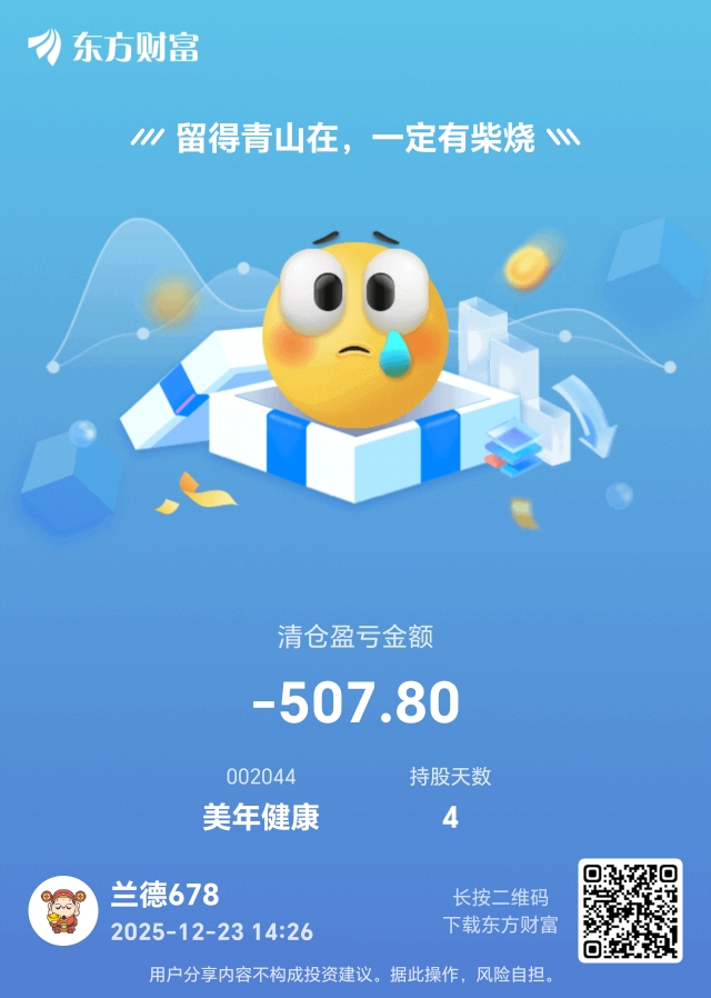 $美年健康(SZ002044)$ 赔了500多,割了。以后再也不敢买这种垃圾股了。