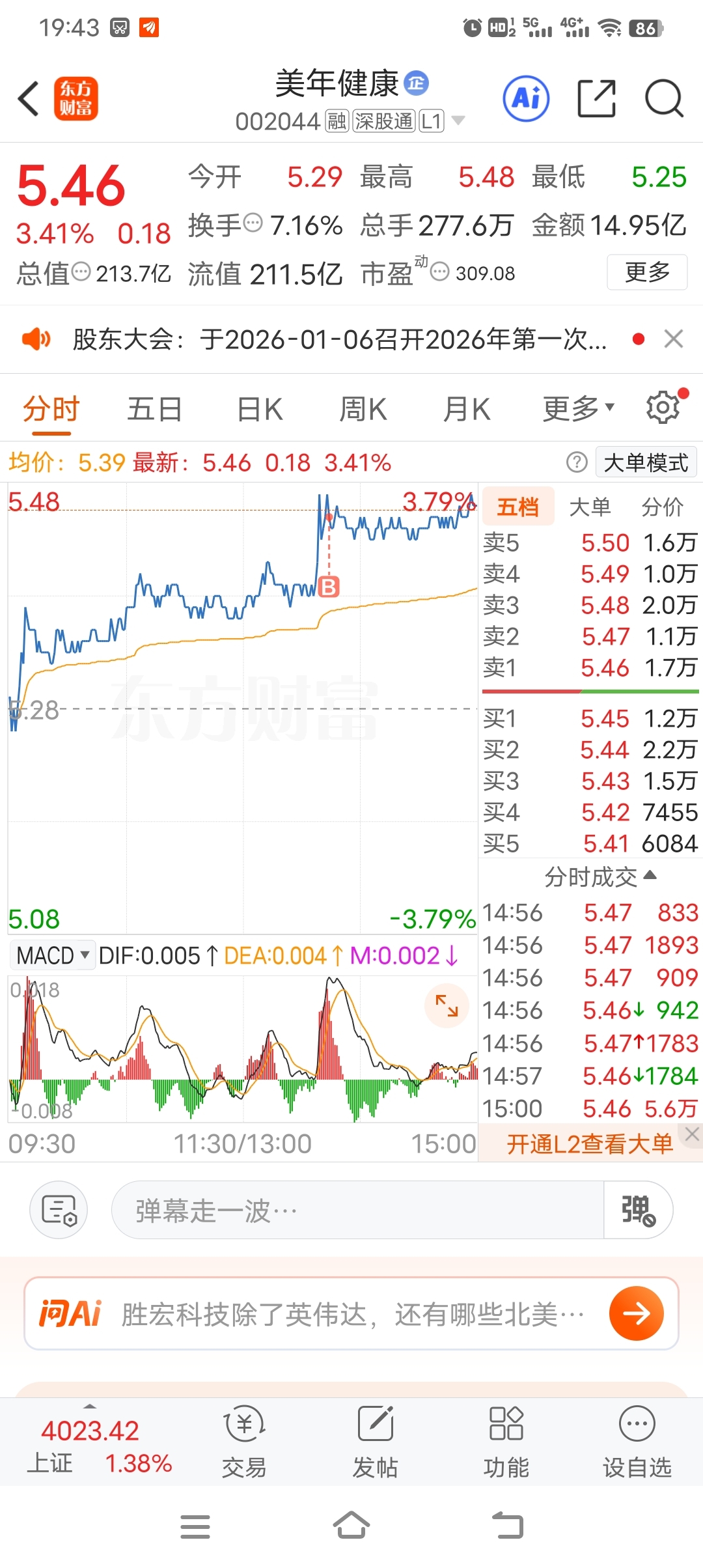 $美年健康(SZ002044)$ 下午AI制药都五个点了,你是真有意思啊!下午一个小时跑出去两三千万收盘回流一千多万,你想咋玩按照自己意思去吧!