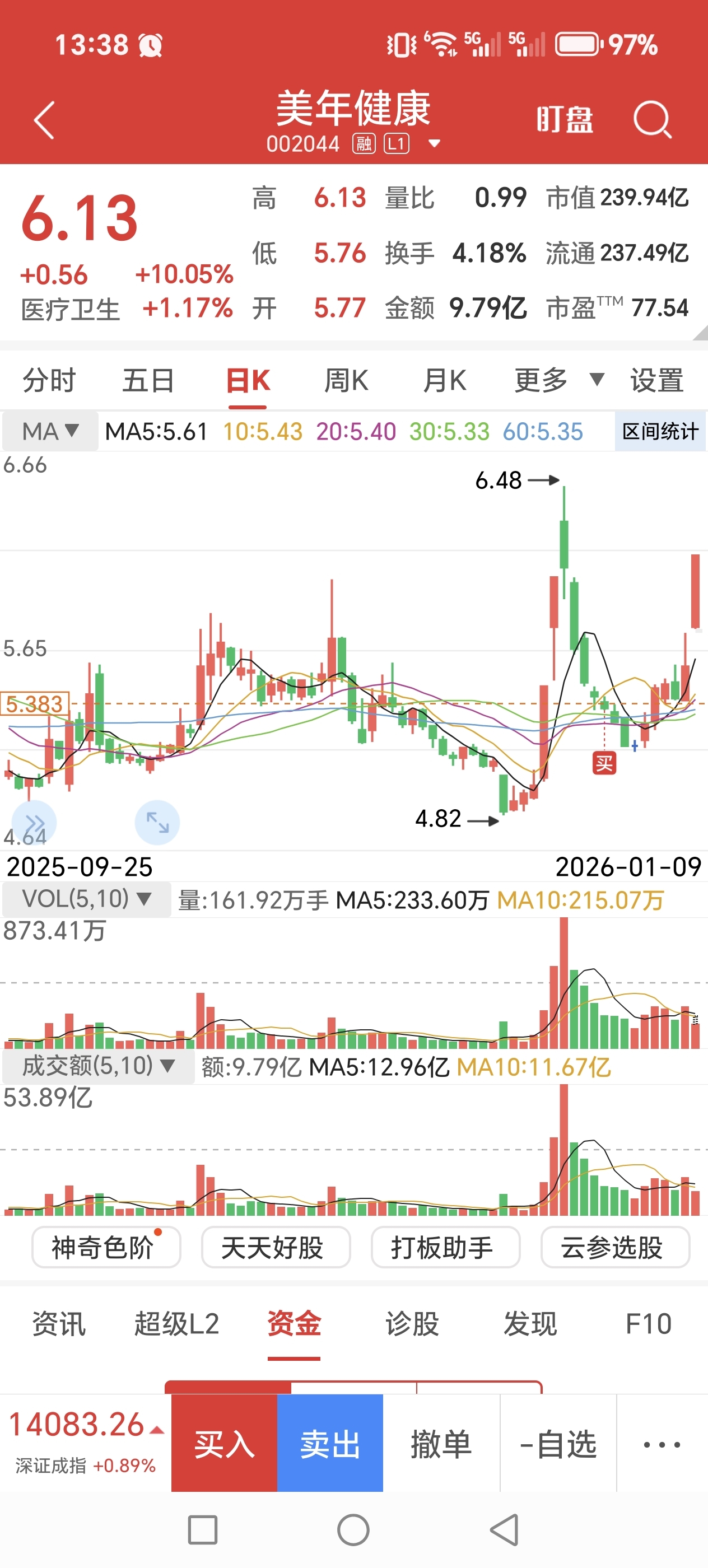 $美年健康(SZ002044)$ 连续下跌5天买入,还是没炒到底,坑已挖过,洗盘干净,突破趋势。