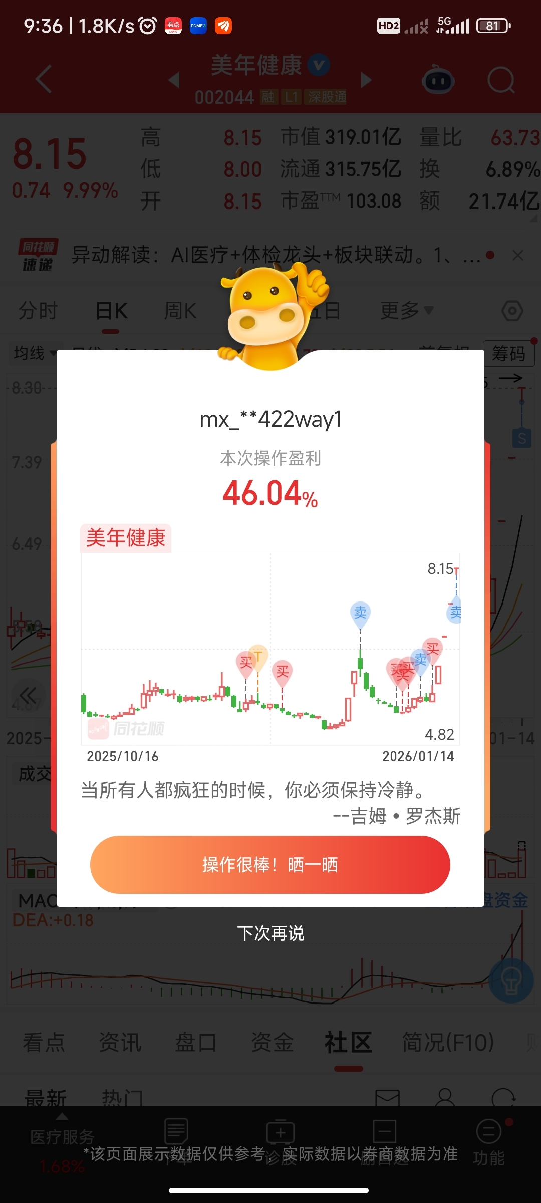 $美年健康(SZ002044)$ 炸板成功把我洗出来了,算了,落地为安,吃了40多个点我也知足了,换股去,美年继续涨吧,我也不会追高了