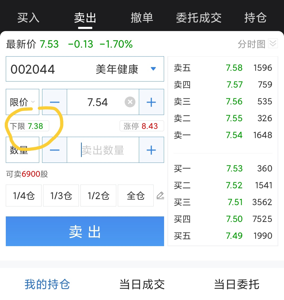 $美年健康(SZ002044)$ 黄圈里面下限为什么不是跌停板价格?