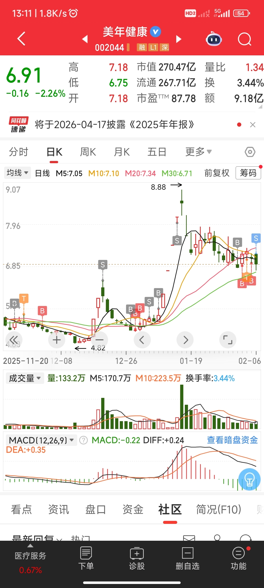$美年健康(SZ002044)$ 今日放量破位下跌,创新低。6.75估计还不是低,还得继续向下盘整,今日先减点仓先