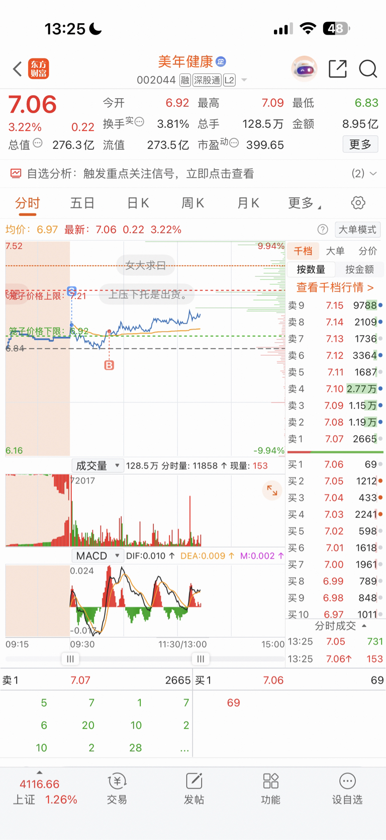 $美年健康(SZ002044)$ 开盘就卖了,上了均线又买回来了……今天再买就出不去了,明天kanbaq