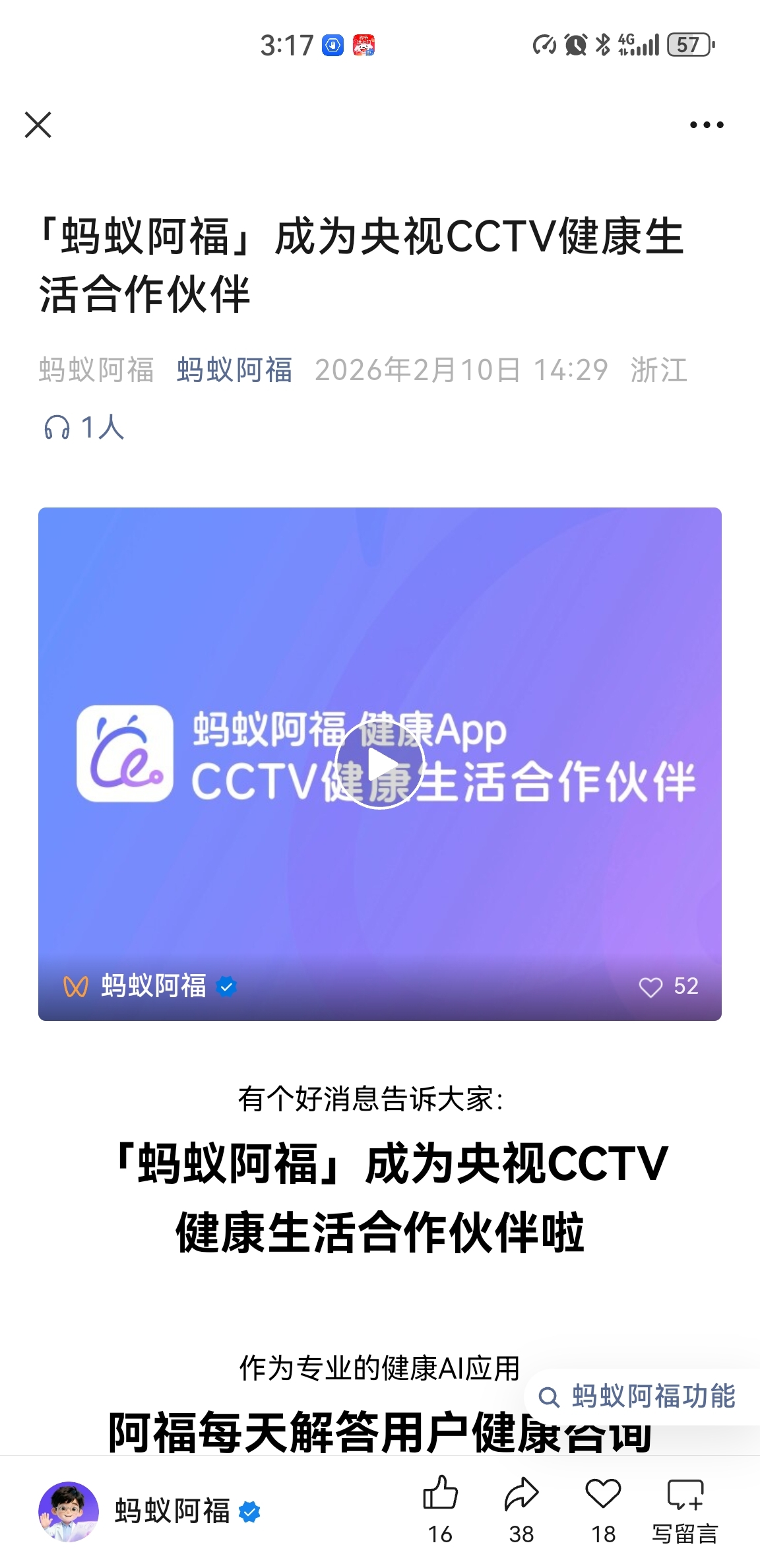 $美年健康(SZ002044)$ 蚂蚁阿福成为了CCTC健康合作伙伴。