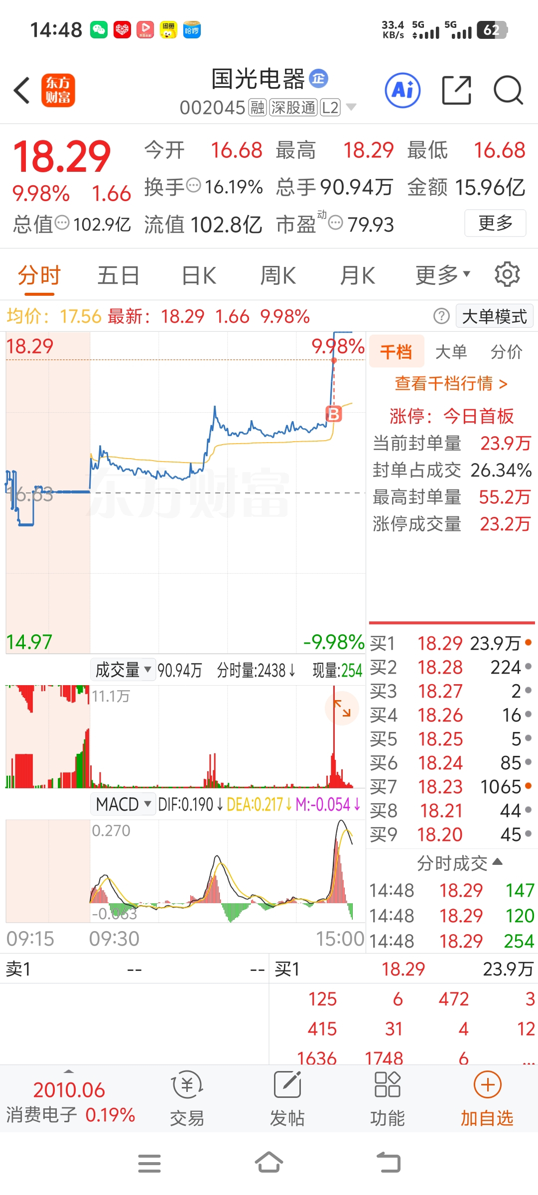 $国光电器(SZ002045)$ 扫板进去的,希望买入确定性,确实封住了,希望下个月给个溢价