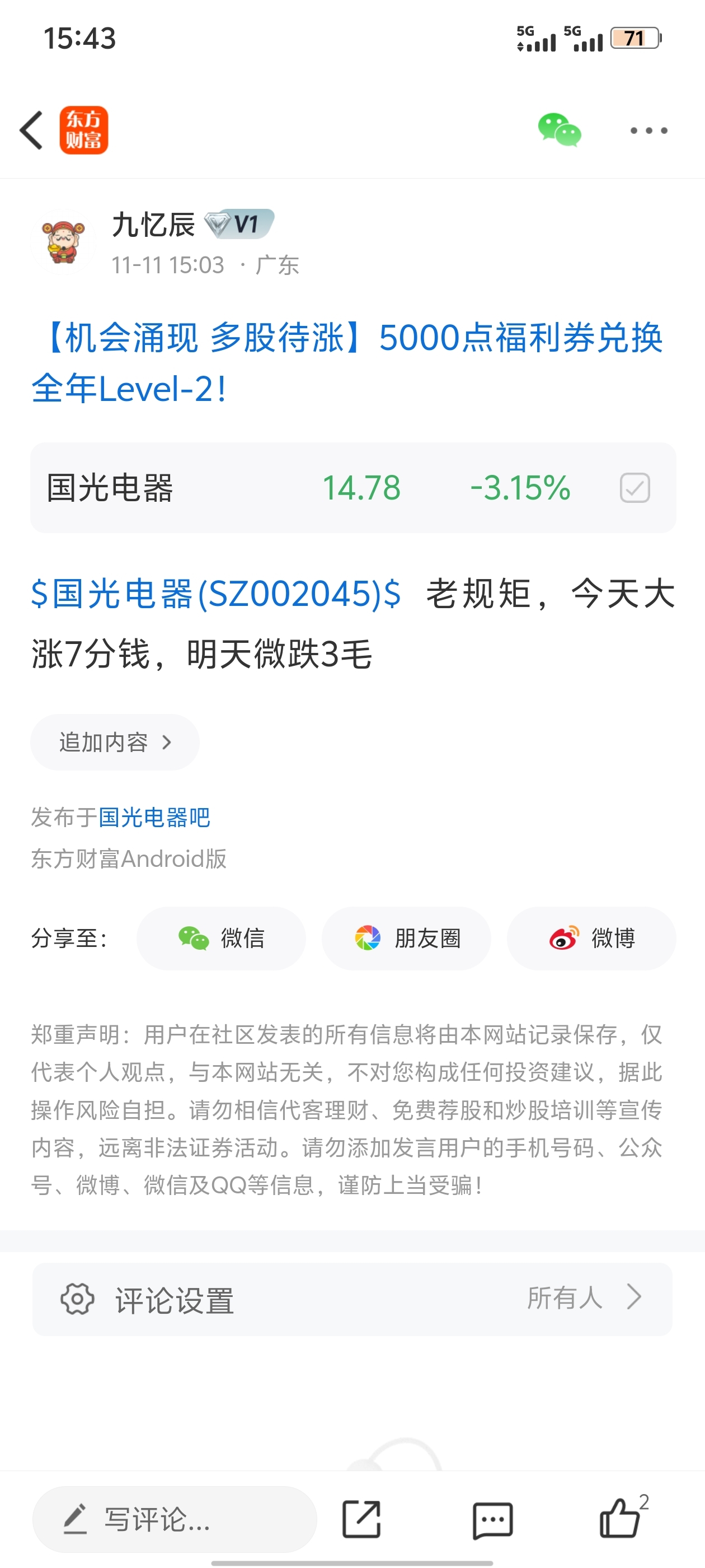 $国光电器(SZ002045)$ 昨天就说了涨7分,今天微跌3毛,结果今天跌4毛,