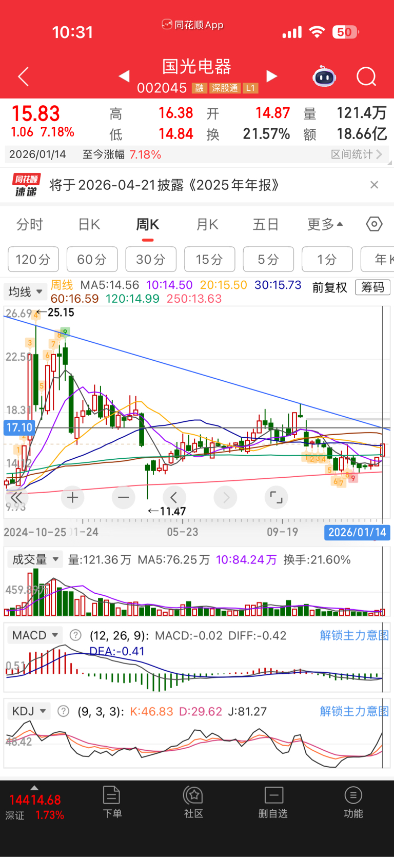 昨天十字星,今天选择向上,突破17块的月线压力,空间打开
