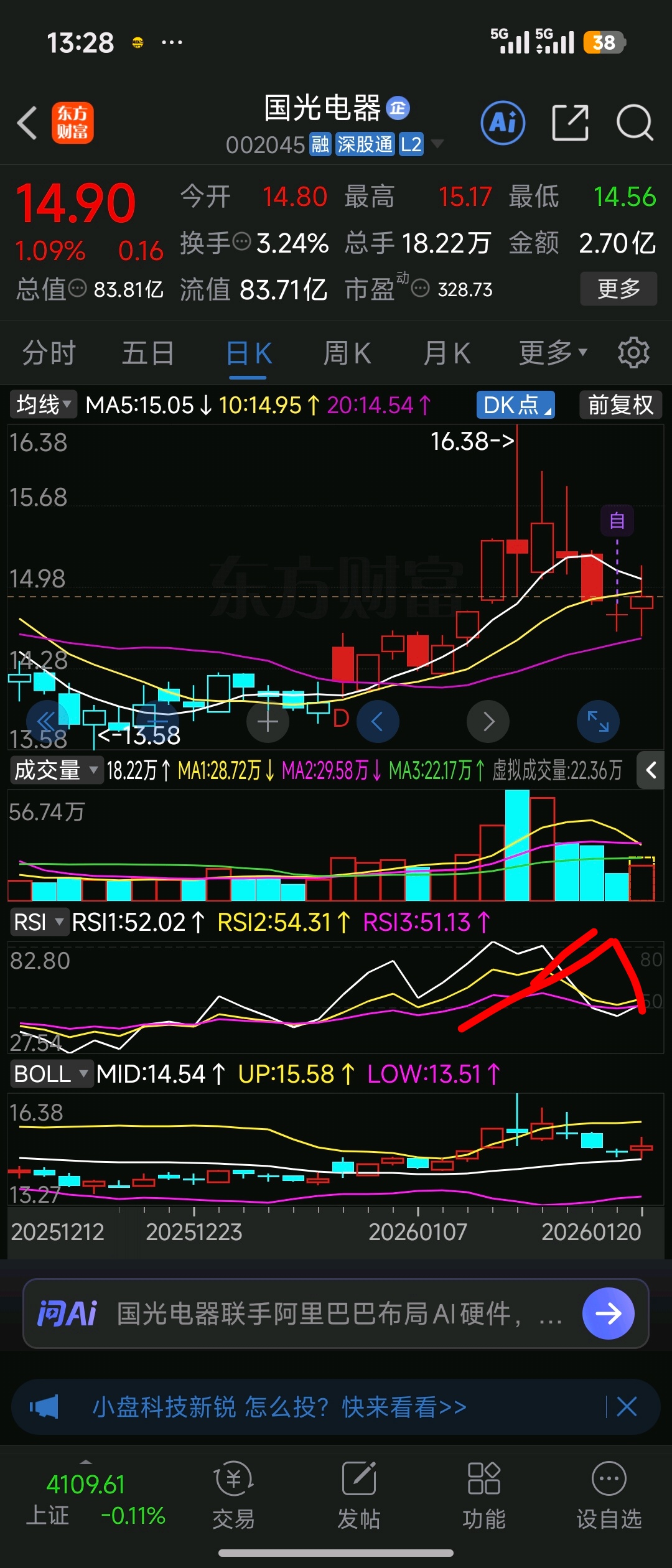 $国光电器(SZ002045)$ 昨天下跌缩量十字星