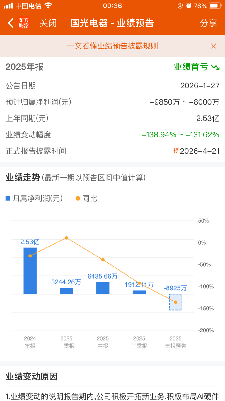 国光电器披露2025年度业绩预告:公司预计归属于上市公司股东的净亏损8000万元至9850万元;扣除非经常性损益后的净亏损1.4亿元至1.59亿元。